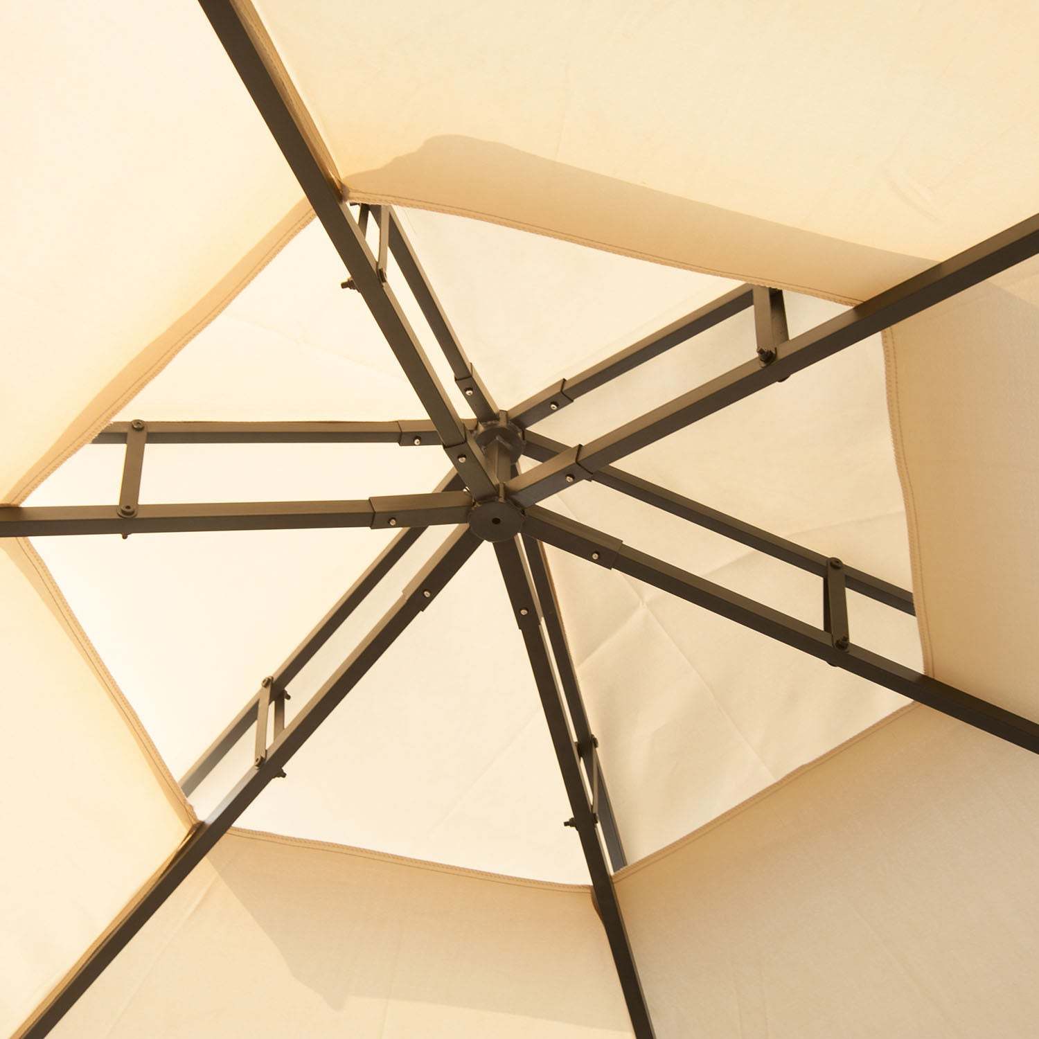 Double-Tier Roof: The two-tier roof makes doesn't just make our deck gazebo more beautiful, it also allows for better airflow without sacrificing protection, and reduces heat and wind stress on the canopy. There is mesh in the roof vents to keep sting out. A PA coating protects from direct sunlight. Twelve draining holes at the top to help drain on rainy days.