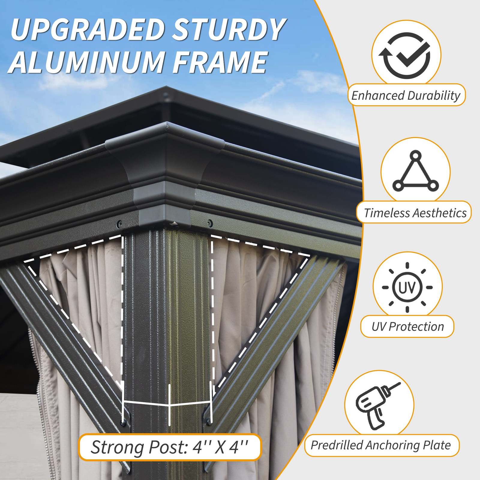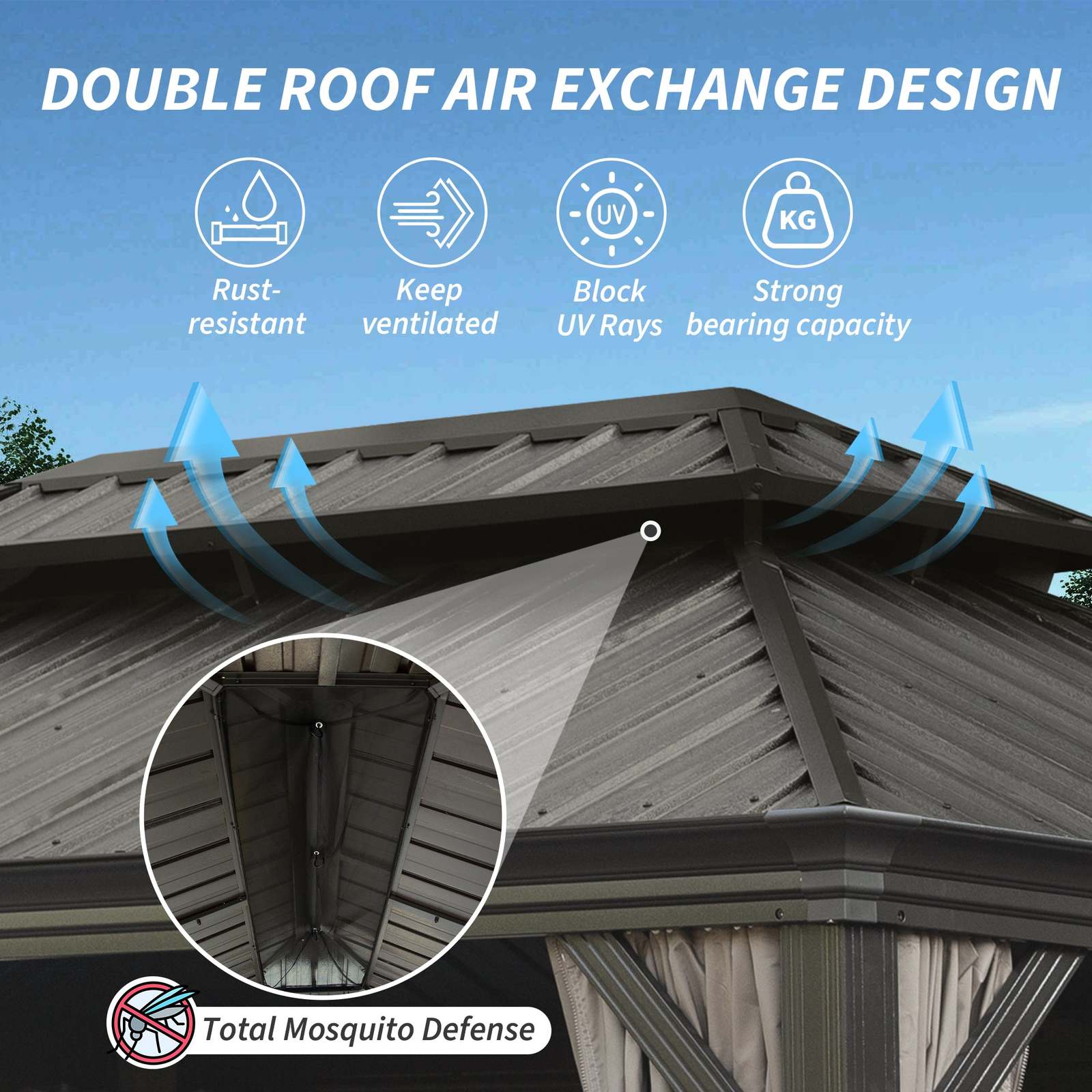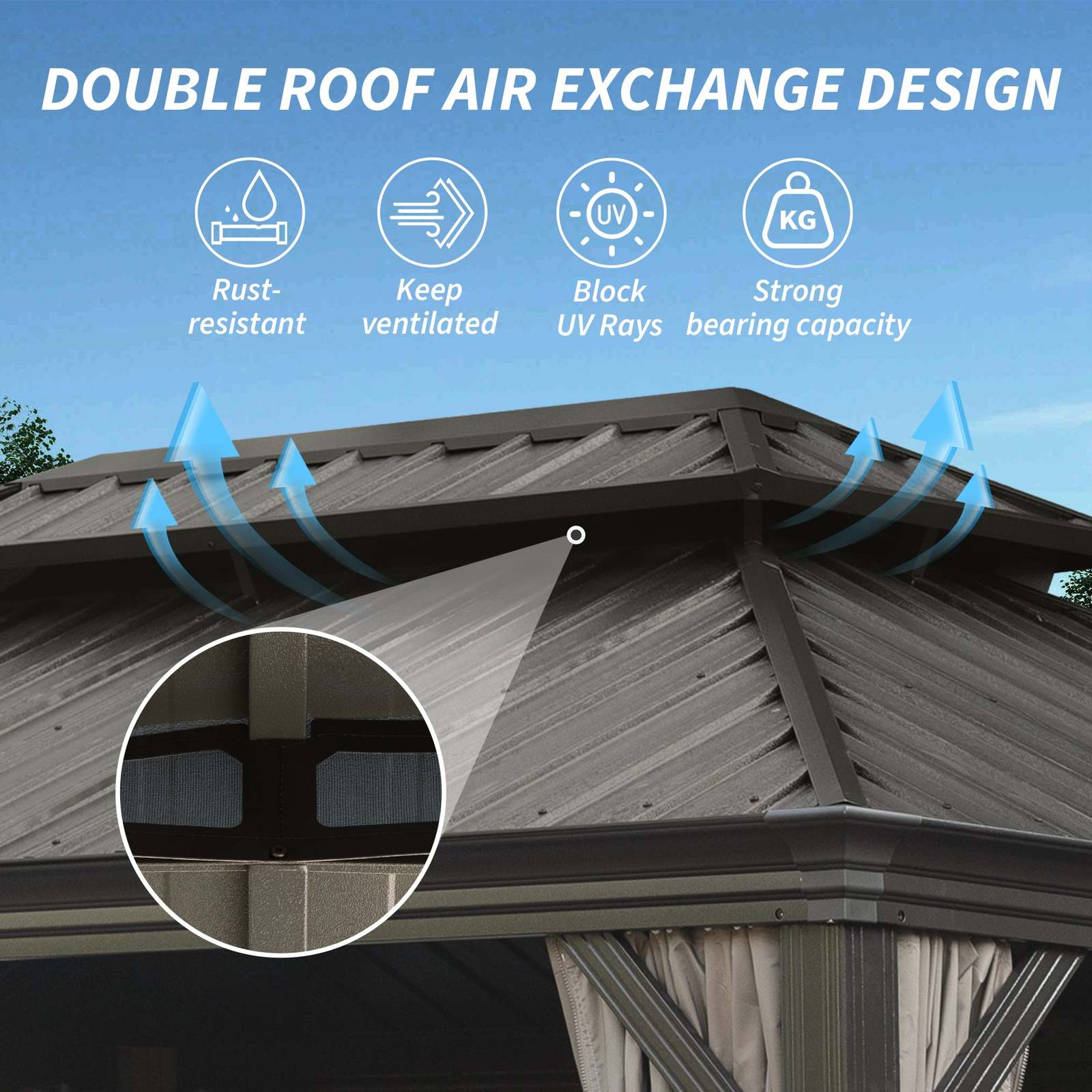 [Ultimate UV Protection and Ventilation] Stay cool and protected with the ventilated double top design of this hardtop gazebo. Offering ample shade during hot summer days while blocking harmful UV rays, it ensures comfort in all weather. Whether you?re lounging, dining, or hosting, the ventilated canopy improves airflow and helps you stay comfortable all day long.