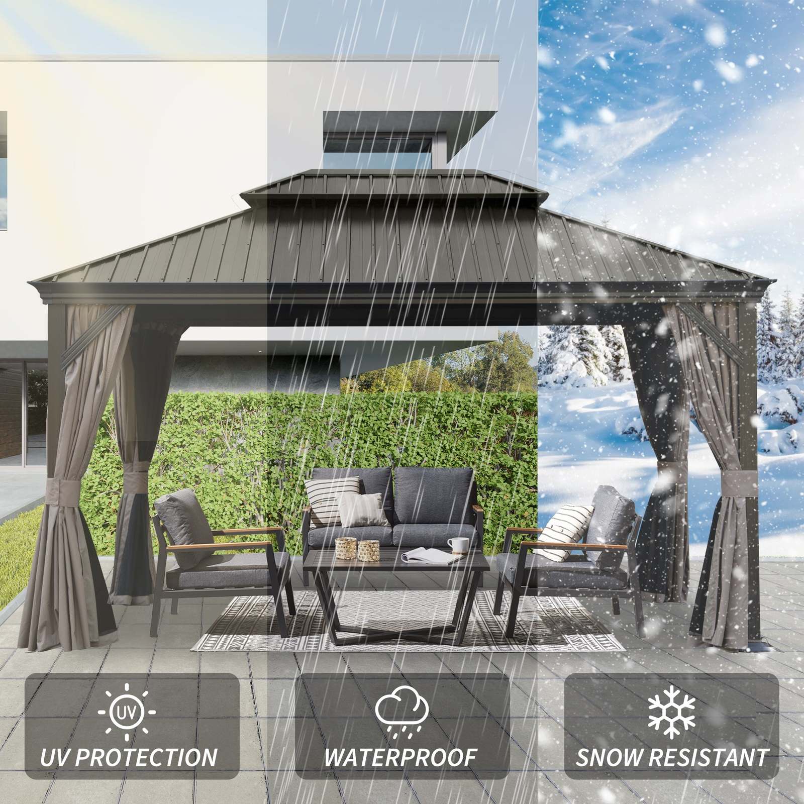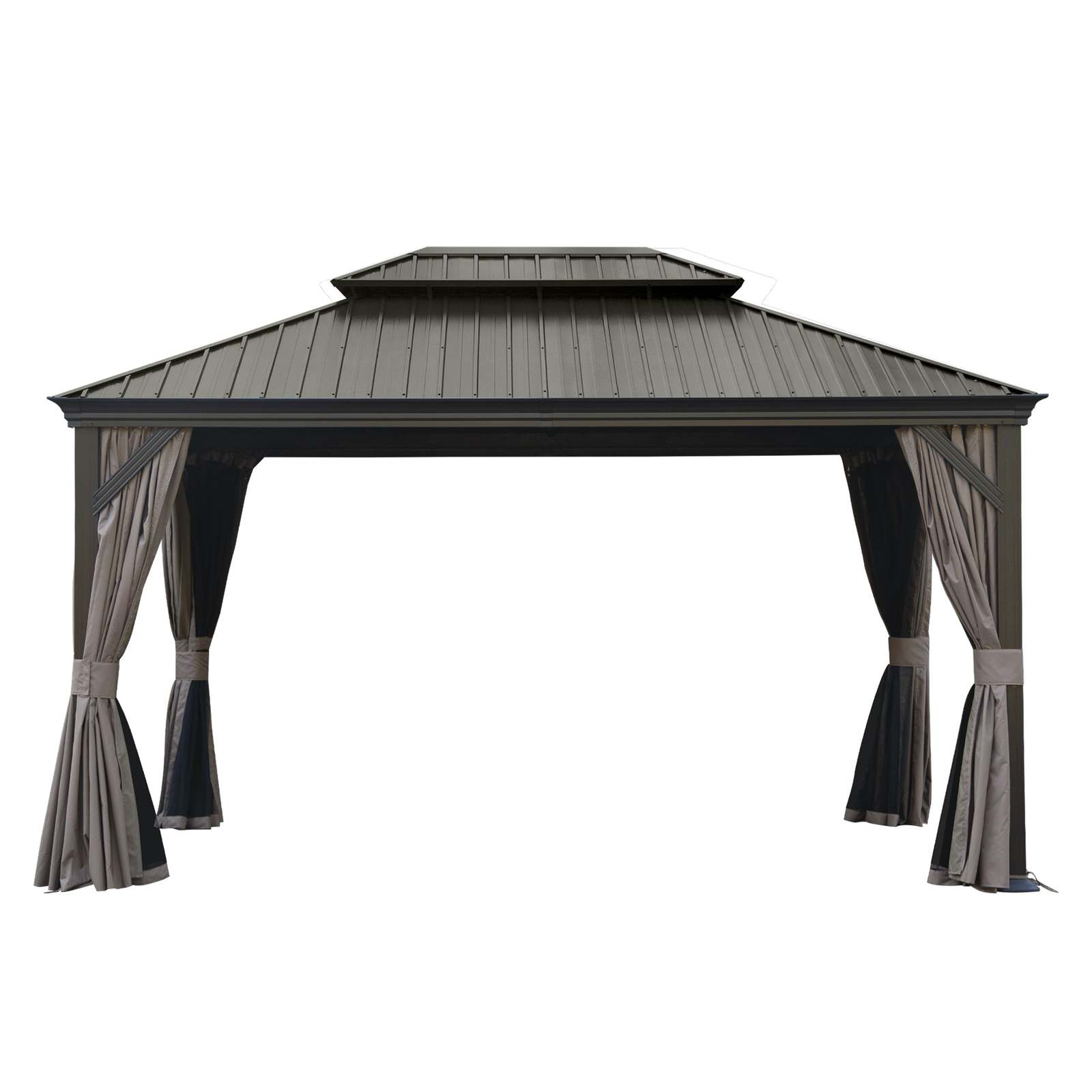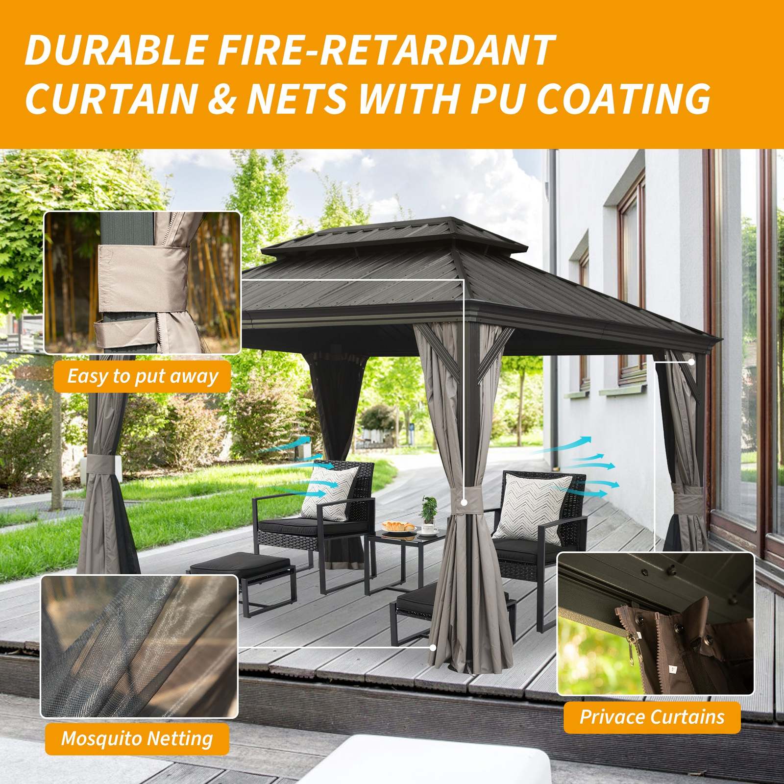 10'x14' Hardtop Metal Gazebo: Dual-Layer Steel Roof, Curtain & Netting