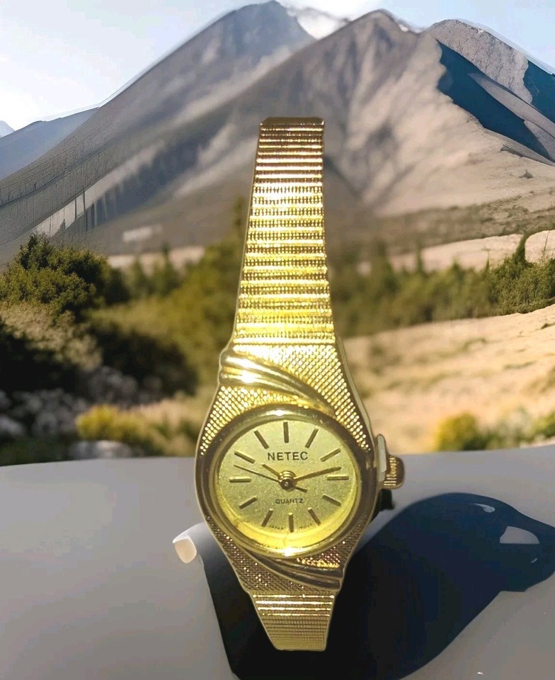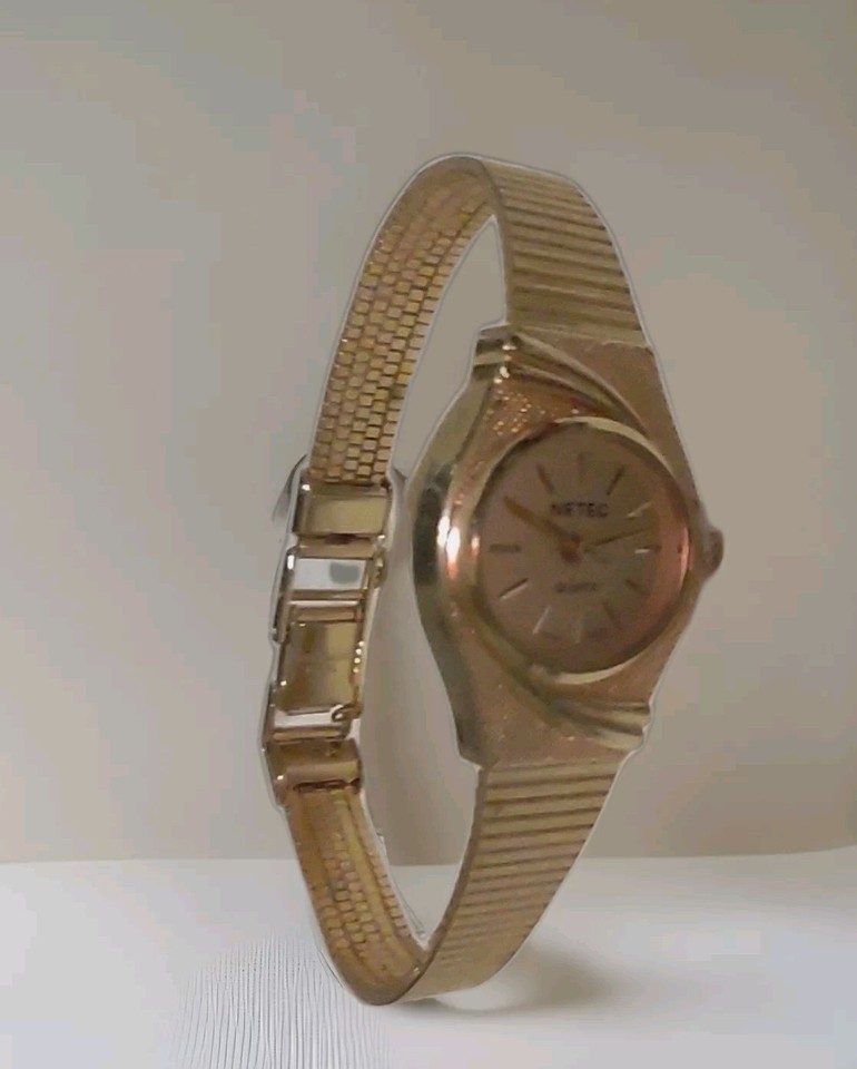 This is a nice and dainty vintage wristwatch made by NETEC. It has a gold tone color and features an oval shape with an analog display. The watch has a quartz movement and a new battery. It is suitable for women and can be worn for both casual and formal occasions. The watch comes without papers and the original box/packaging. The band and dial also have a gold color. The case size is 18 mm.