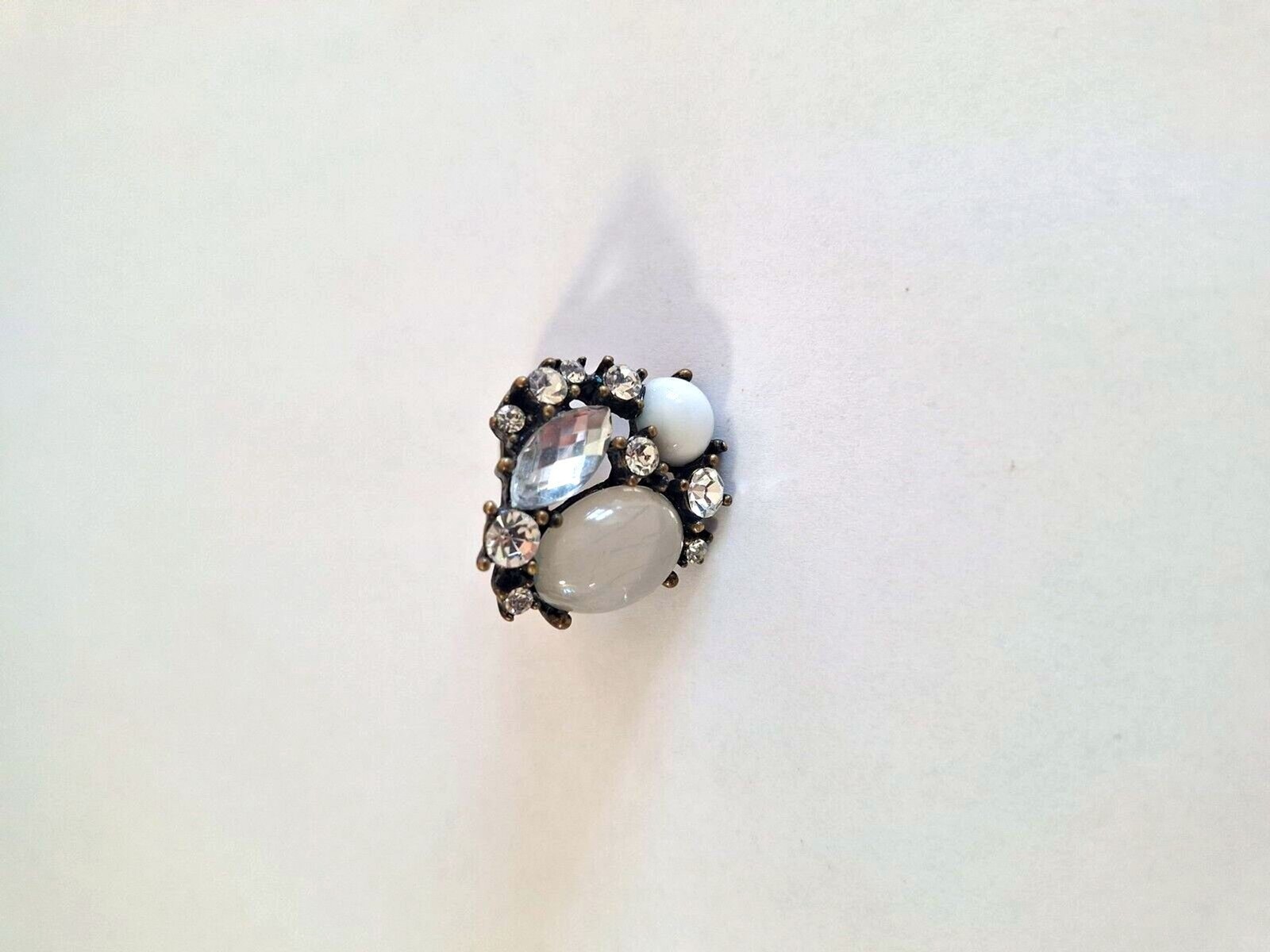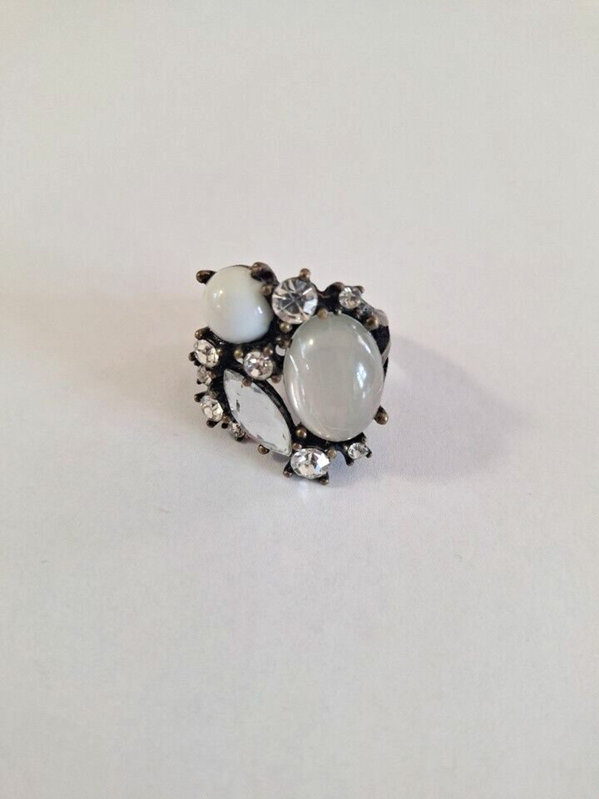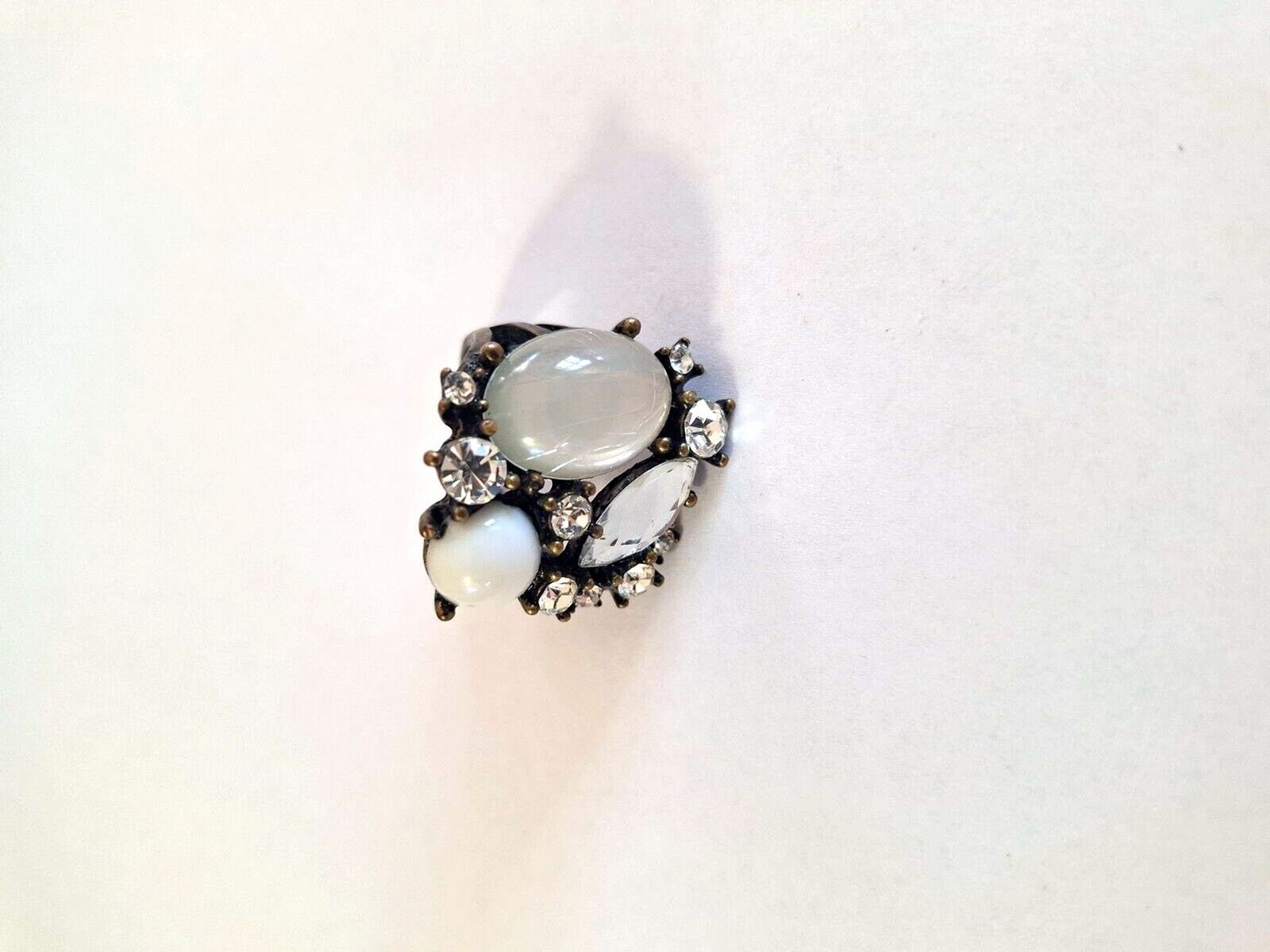 Moonstone Cabochon & Jeweled Rhinestone Ring Size 8-9 Brassy Statement Vintage