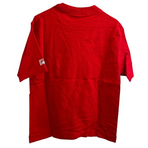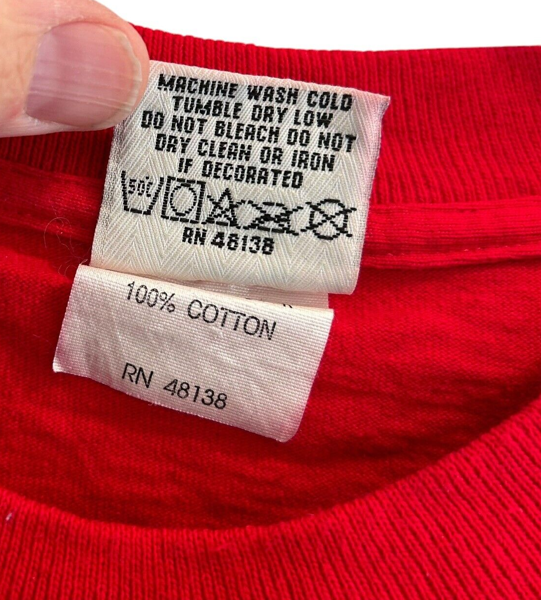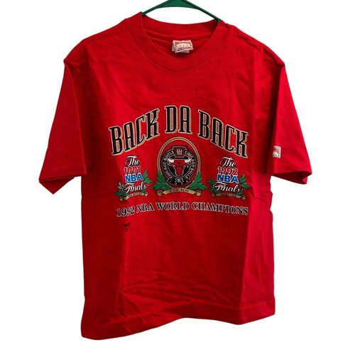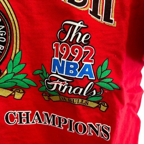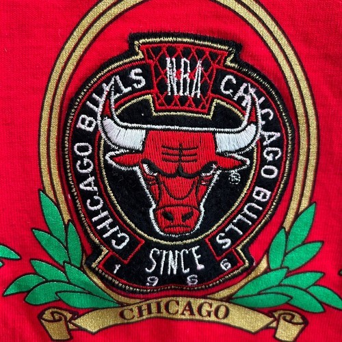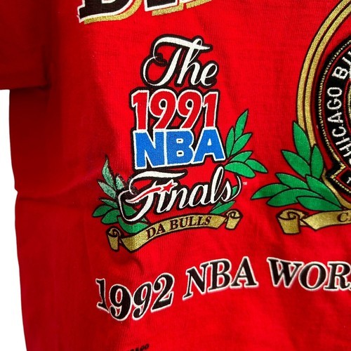 This is a brand new vintage from 1992 embroidered Nutmeg brand t-shirt featuring the Chicago Bulls, the NBA team for which Michael Jordan played. The shirt commemorates the Bulls' back-to-back championships in 1992, with the design showcasing team pride. As an officially licensed product, it is made in the United States and sized as a large for men. The shirt is RED in color and is a great addition for any fan of the Chicago Bulls or basketball in general. This is an amazing find especially because it is brand new from over 33 years ago!