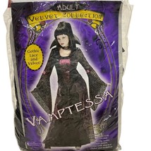 This Vampressa costume offers a captivating look with its velvet gown and lace sleeves. Perfect for Halloween or themed parties, it includes a collar with an attached choker and medallion, adding a touch of mystery to your attire.