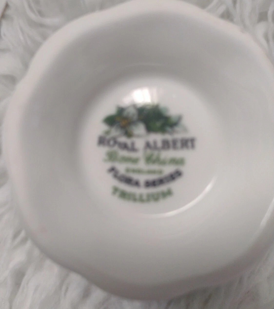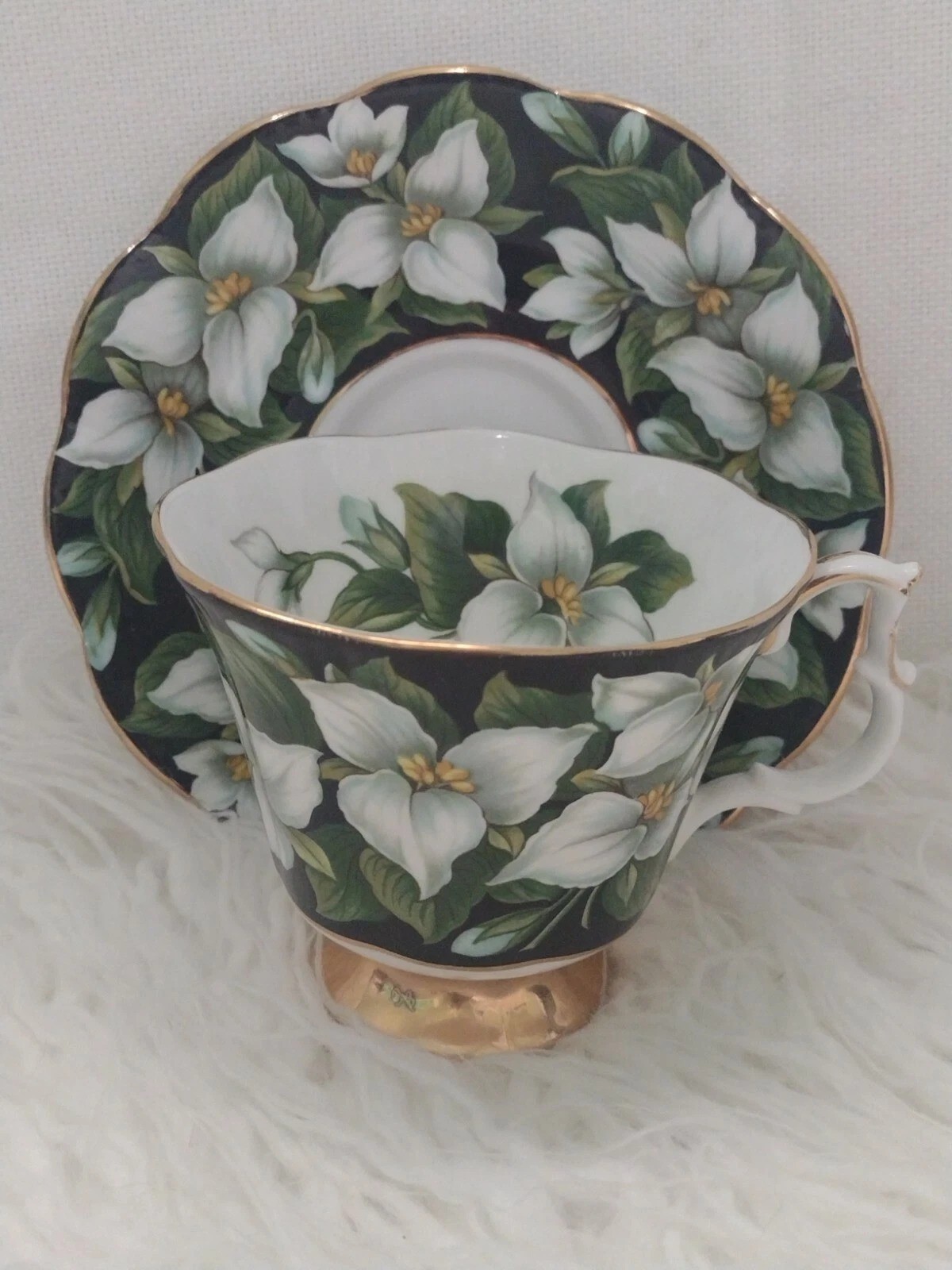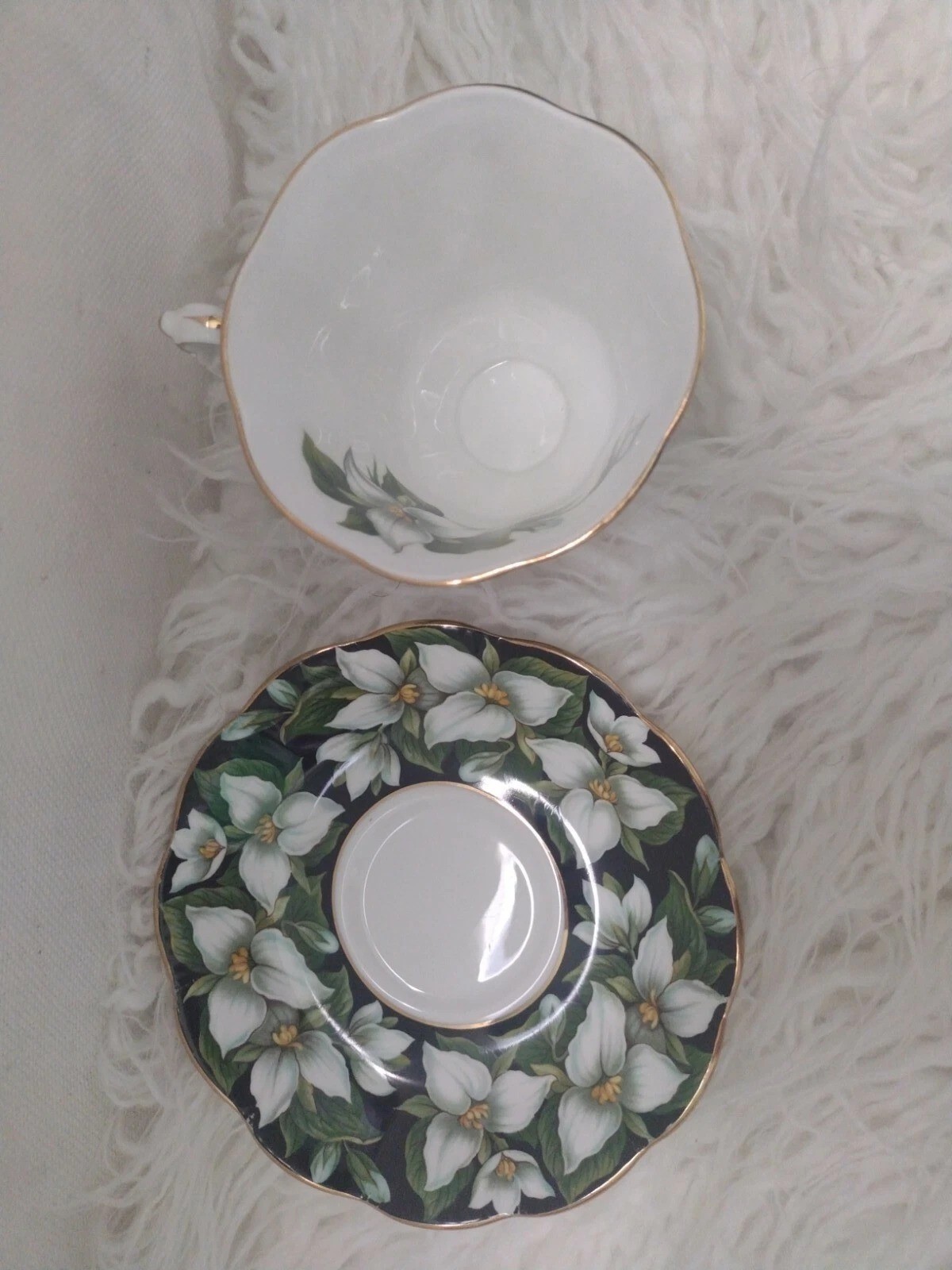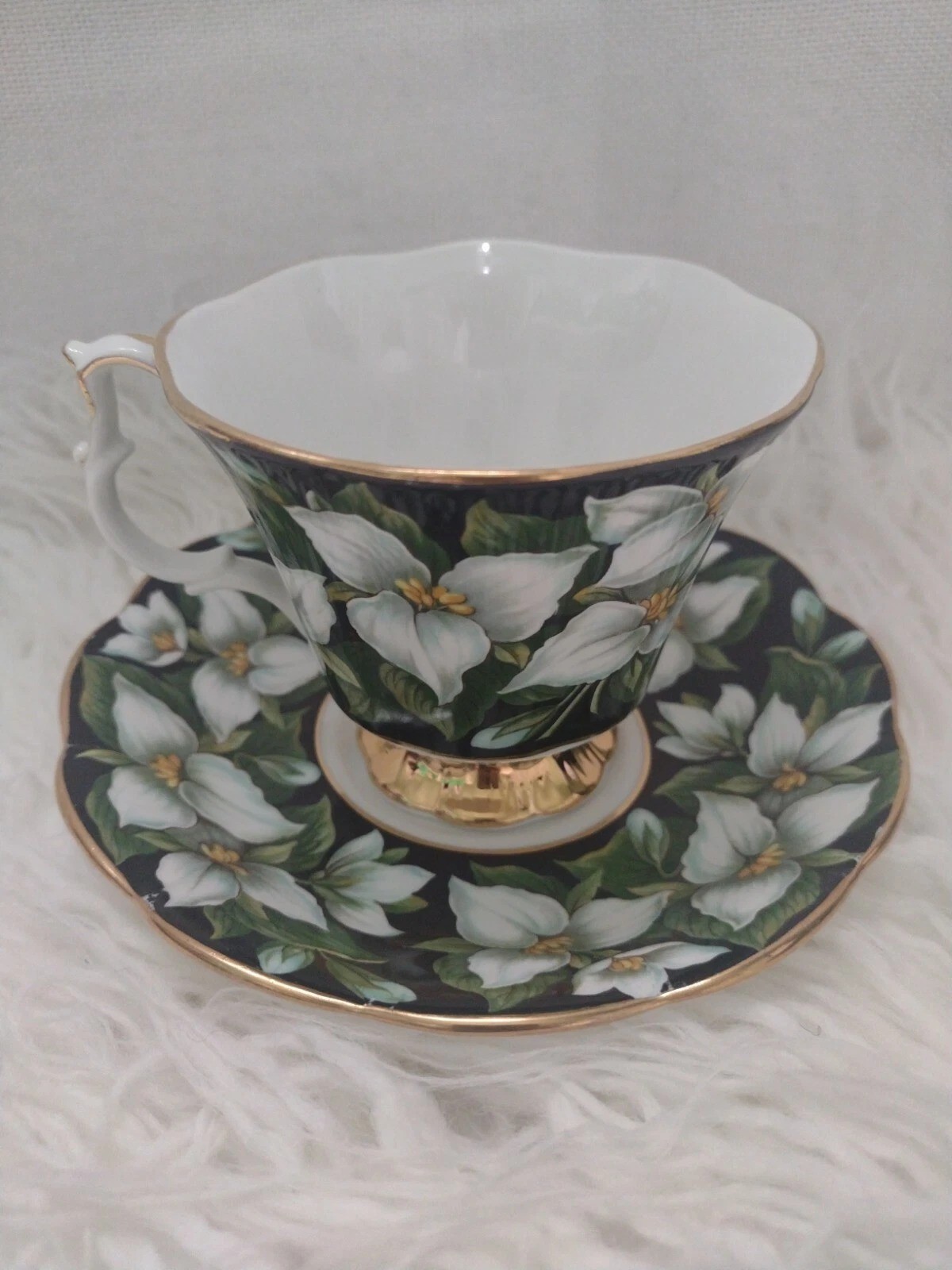 ROYAL ALBERT FLORA SERIES TRILLIUM TEA CUP AND SAUCER. Has a manufacturers defect on the saucer. Please see pictures. All items are second hand and as such may have gold wear.
