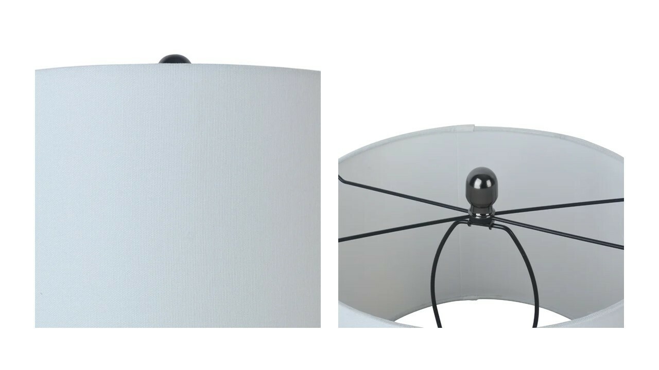 Topped with a crisp white drum shade, the lamp creates a stunning contrast that enhances its visual appeal. The bright white fabric shade diffuses light softly, reducing glare while brightening the room with a warm, inviting glow. This elegant interplay of dark and light not only highlights the lamp?s design but also allows it to blend seamlessly into a variety of interior styles?from minimalist and contemporary to industrial and mid-century modern.