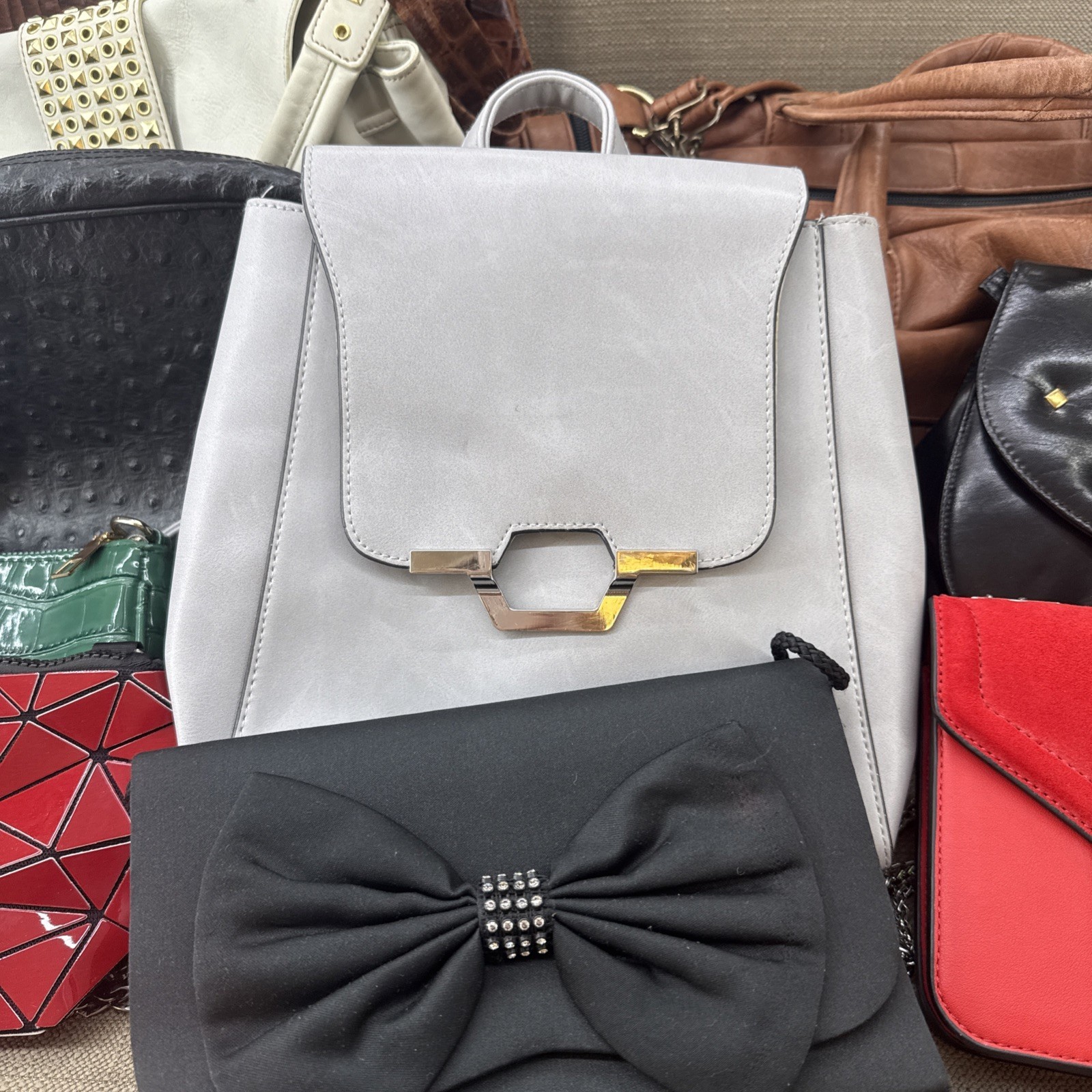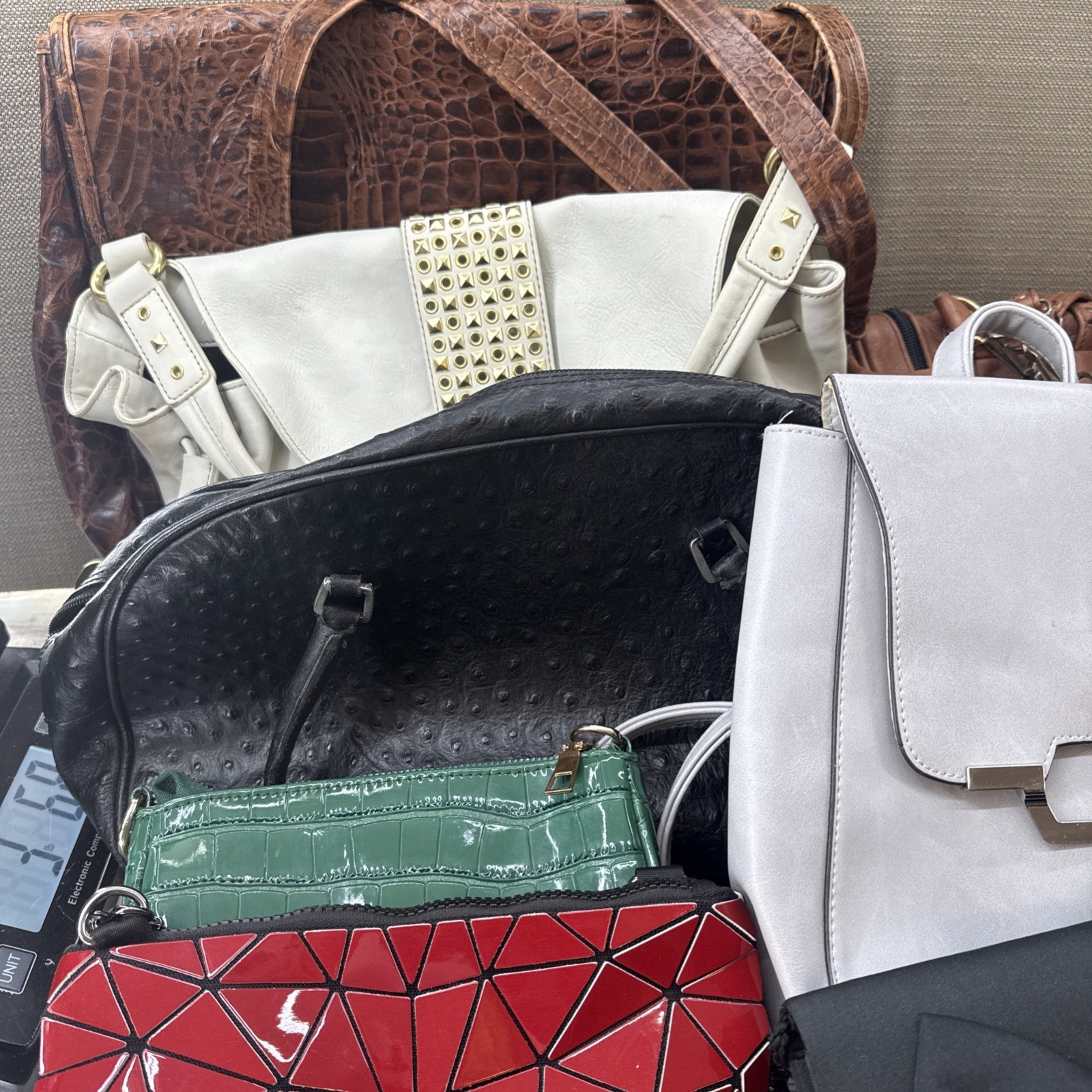 This bundle includes 11 handbags and purses in a mix of styles and materials. Featured brands and designs include: Kenneth Cole New York white boho bag, Mossimo white backpack purse, genuine Italian leather tote, Patricia Luca red crossbody bag with geometric design, Besozzi Franco black leather crossbody, Bruno Magli black leather purse with gold accents, a dressy black satin evening bag with bow, a green faux crocodile crossbody with straps, a brown leather duffle bag, a black ostrich-embossed satchel, and two red Lululemon shopper totes. All are preowned in great condition with normal signs of wear.