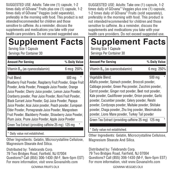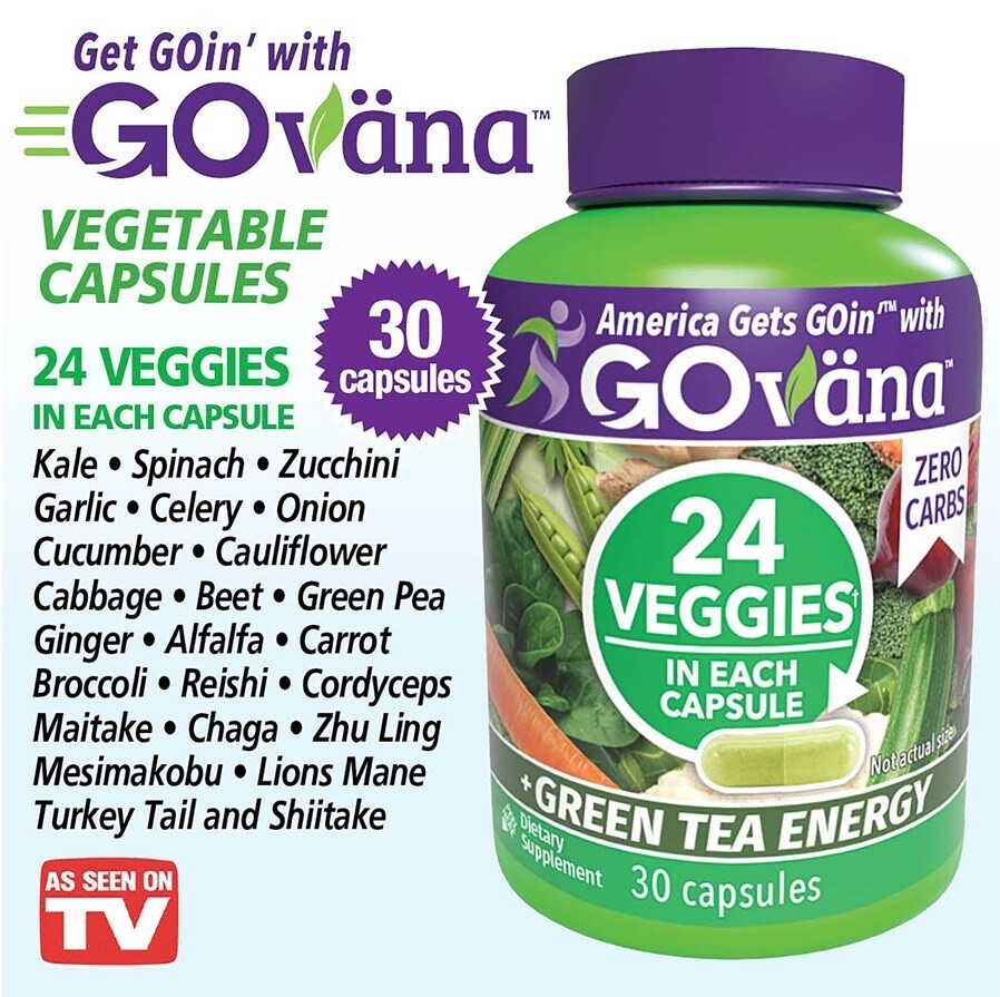 GOvana Ulta-Premium is the power capsule packed full of 24 whole vegetables in one easy to swallow capsule. That's 50% more than the original product! Their process starts with farm fresh vegetables that are picked, washed and made into a nutritious juice which is transformed into delicious, capsules. Now it's easy to get healthy with PHYTONUTRIENTS, antioxidants, green tea extract for energy without the jitters. Just take one (1) easy to swallow capsule 1-2 times daily, preferably in the morning with food.