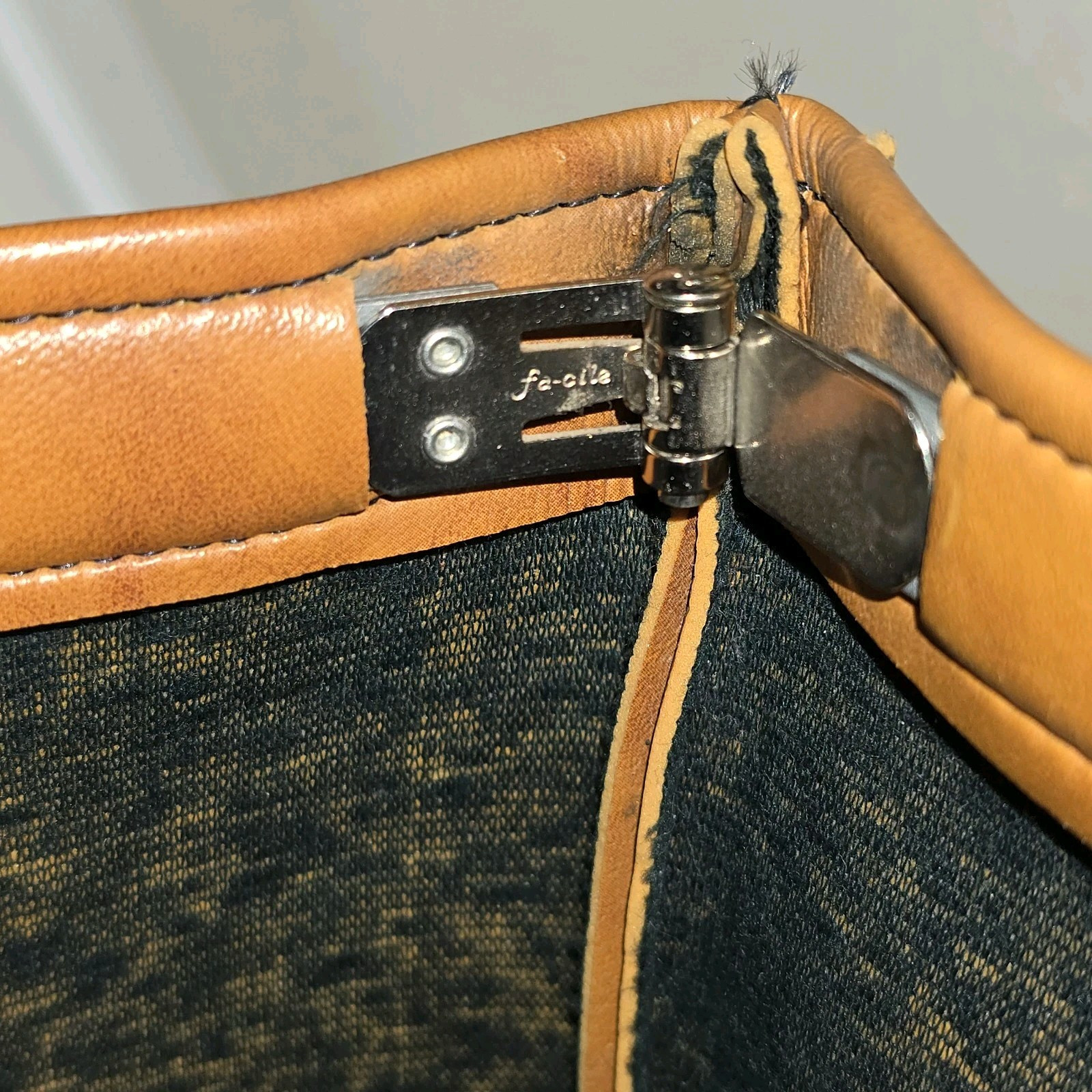 ***This is Vintage pre-owned and in good condition but does have some black marks on the leather. I have not tried cleaning it. Interior lining is great. The spring / pop frame is also good. Please See Photos!***