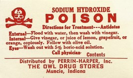 Pharmacy Label SODIUM HYDROXIDE Poison Owl Drug Stores Muncie IN |