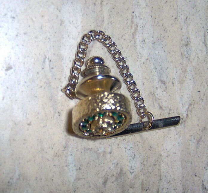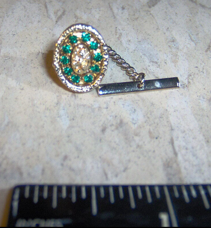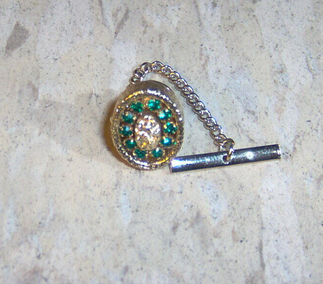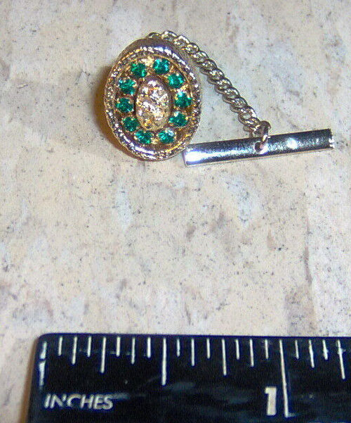(1) USED and VINTAGE 1960s GREEN AND GOLD color TIE TACK aka TIE PIN BY DANTE BRAND. BEAUTIFUL OVAL TIE TACK (also known as tie pin) IS IN EXCELLENT CONDITION, A TINY BIT OF CORROSION ON THE REAR FACING PIN, OTHERWISE A BEAUTIFUL EXAMPLE OF DANTE CRAFTSMANSHIP. ENCRUSTED GREEN (unknoqn) STONES MAKE UP THIS TIE TACK, DISTINCTIVE DANTE DESIGN, THIS TIE TACK WILL MATCH MANY OF THE VINTAGE DANTE CUFF LINKS. 1/2" diameter OVAL DISPLAY FACE SHOWS THE ENCRUSTED GREEN UNKNOWN STONES. THIS TIE TACK REALLY SHOWS OFF. ADD THE MATCHING DANTE GREEN CUFFLINKS FOR MAXIMUM BLING. THE TIE TACK HAS A REAR LOCKING CLUTCH BACKING (TACK CLUTCH WITH CHAIN) TO HOLD THINGS IN PLACE AND WORKS PERFECTLY. A CLOSE INSPECTION OF THIS TIE TACK BY DANTE REVEALS IT IS IN NEAR PERFECT CONDITION. YOU WILL RECEIVE THE DANTE TIE TACK, EXACTLY AS PICTURED HERE, SHIPPED BY USPS FIRST CLASS
