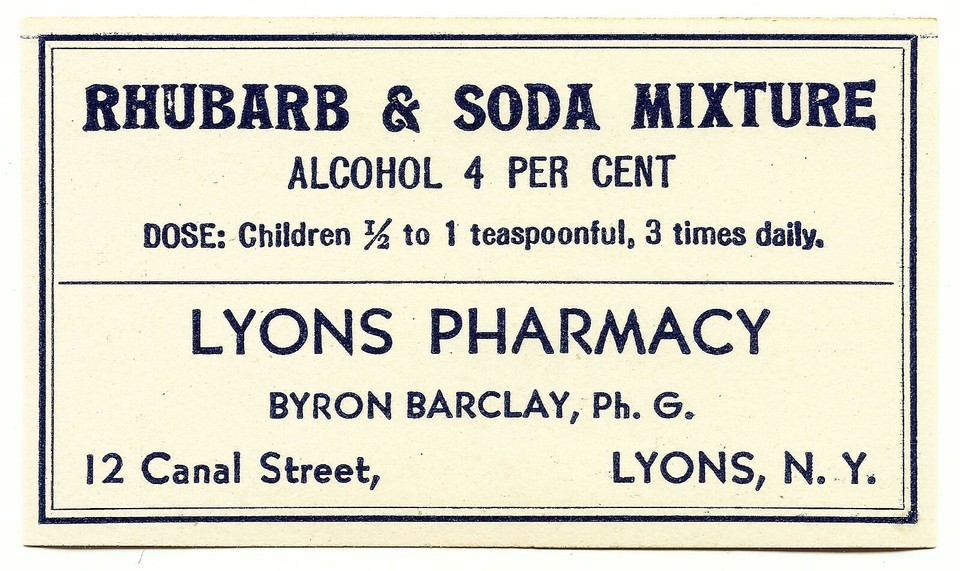 Pharmacy Label RHUBARB AND SODA MIXTURE Lyons Pharmacy Lyons NY |