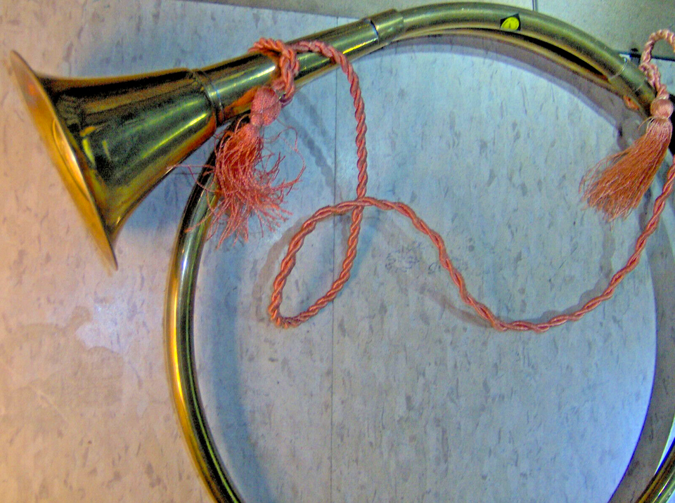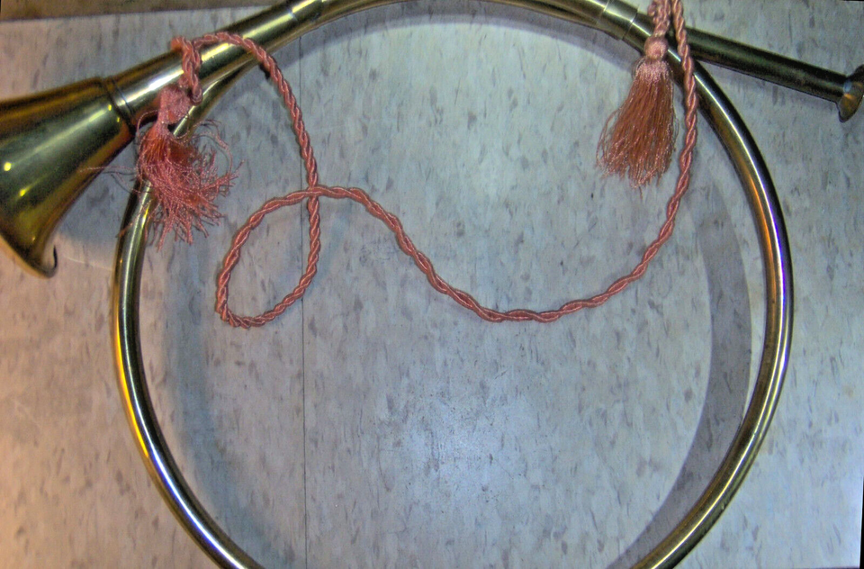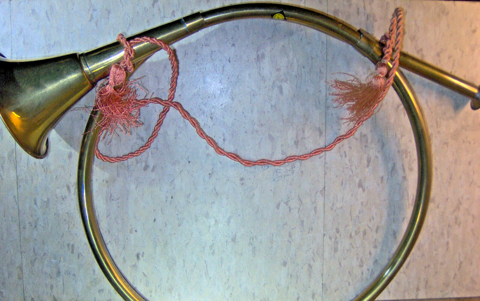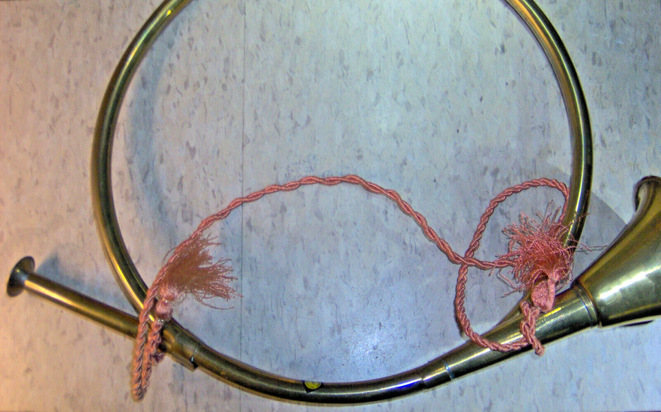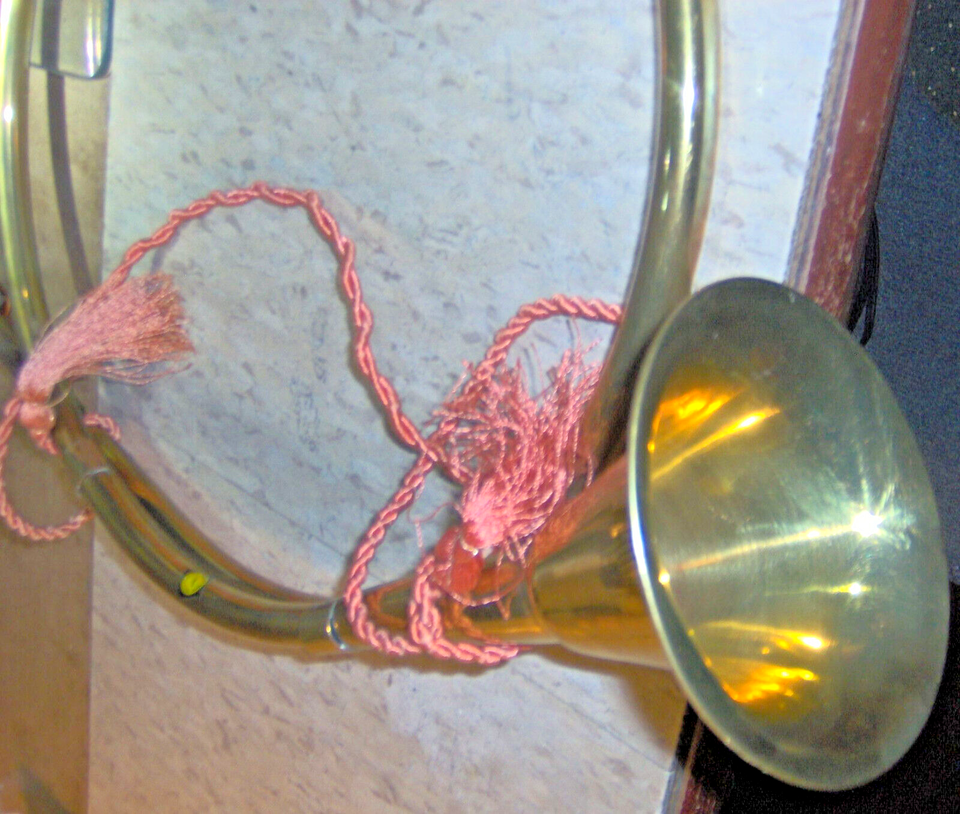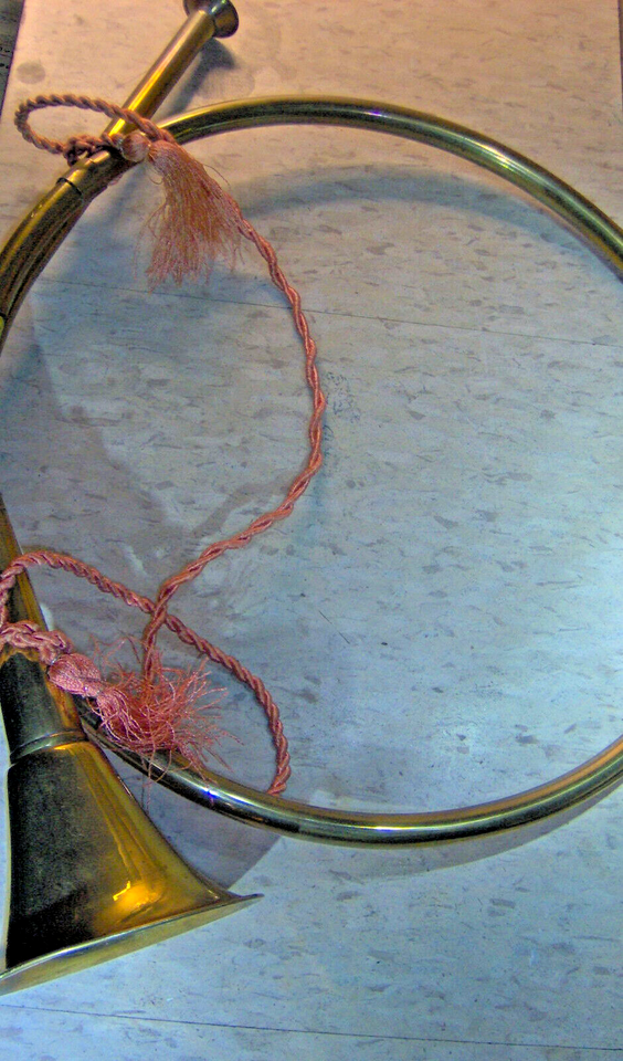 (1) VINTAGE USED BRASS ON METAL HUNTING HORN 13.5" diameter DECORATION WITH RED TASSLED ROPE. REAL BRASS ON METAL CONSTRUCTION, ROBUST 13.5" DIAMETER COILED BRASS HUNTING HORN DESIGN, TOTAL LENGTH IS 17 1/2" FROM MOUTHPIECE TO BELL, WITH A 4 1/4" DIAMETER FLARED BELL, TRUE BRASS WITH NICE PATINA WITH NO MAJOR DINGS OR DENTS. VINTAGE ESTIMATE AROUND 25-30 YEARS OLD, THIS BRASSY HUNTING HORN DECORATION ACTUALLY WORKS, ALTHOUGH DESIGNED FOR DECORATIVE USE ON CHRISTMAS TREE, FRONT DOOR DECORATION, HANG ON THE WALL, TABLETOP DISPLAY DECORATE YOUR HUNTING LOUNGE, GUN ROOM, ETC. HISTORICALLY, THE HUNTING HORN WAS A 3 octave MUSICAL INSTRUMENT USED DURING THE FOX HUNT TO COMMUNICATE BETWEEN THE HUNTERS AND THEIR DOGS. THIS IS A DECORATIVE PIECE, NOT A MUSICAL INSTRUMENT. YOU
