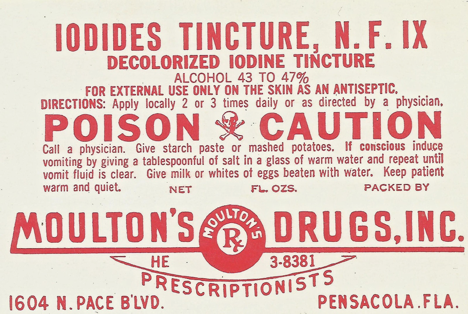 Antique Pharmacy Label IODIDES TINCTURE, N.F IX iodine Moulton's Drugs Pensacola