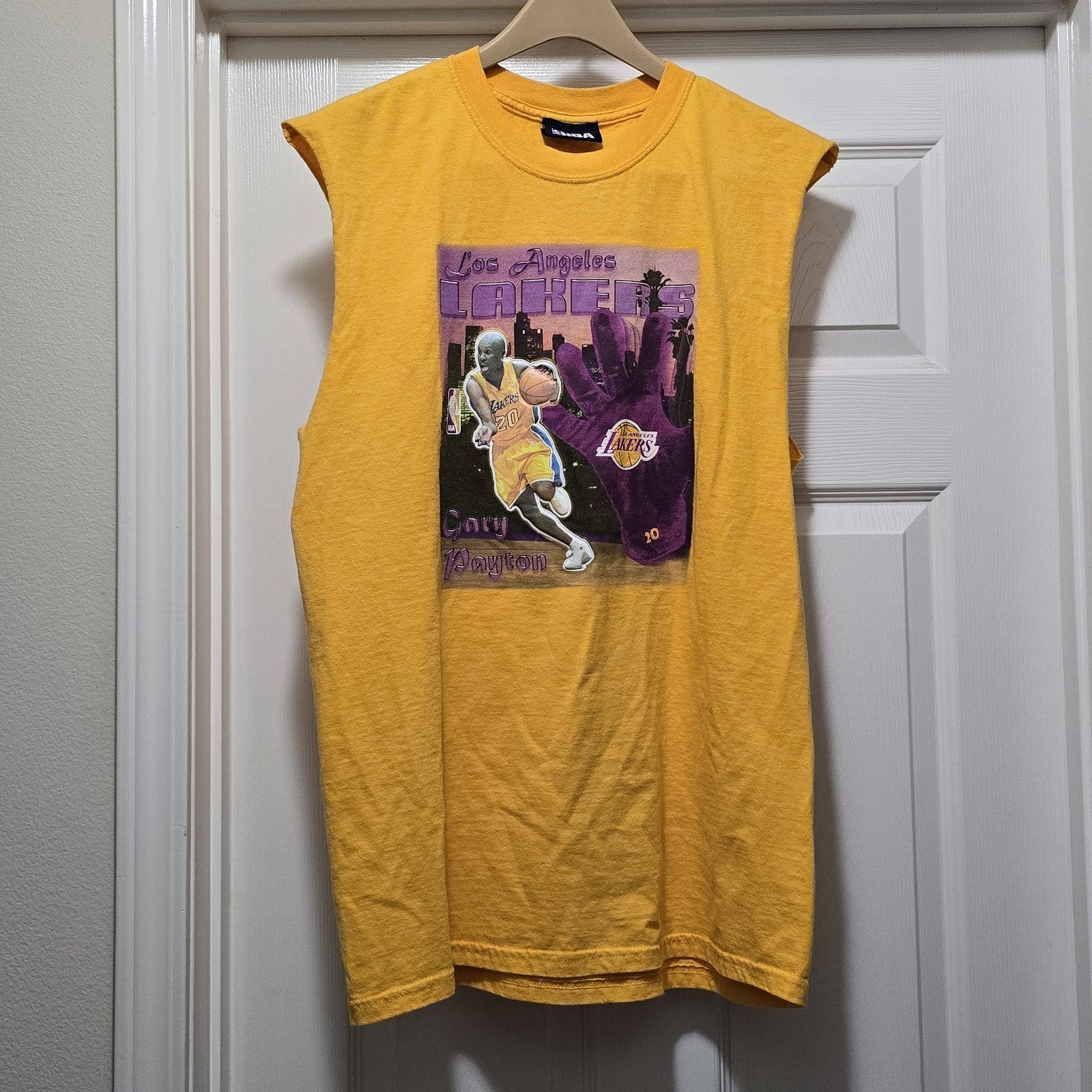 Great pre-owned Condition Vintage Y2K Yellow Los Angelos Lakers Gary Payton Shirt with (homemade) Cutoff Sleeves - Men's Size M. Actual measurements: 43" chest, 30" length.