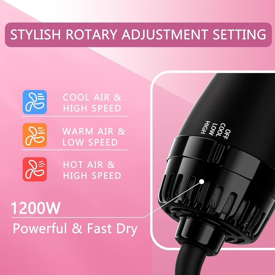 Efficient Convenient: Built with 1200W power and 3 heat settings (COOL/WARM/HOT) for customizable styling, featuring a stylish rotary adjustment button for easy operation.