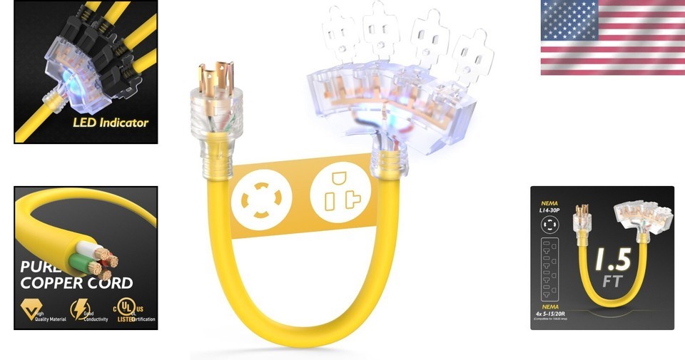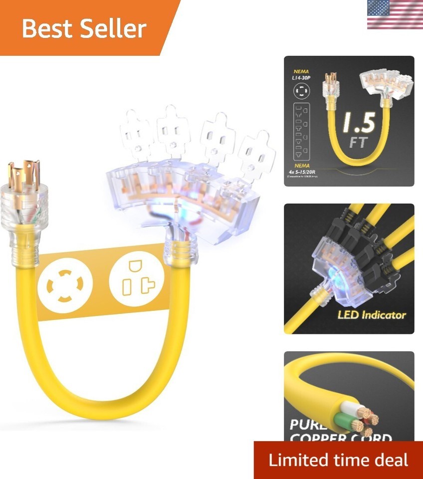 ETL Listed 30 Amp Generator Splitter Cord - 1.5 FT Extension for Home & Camp