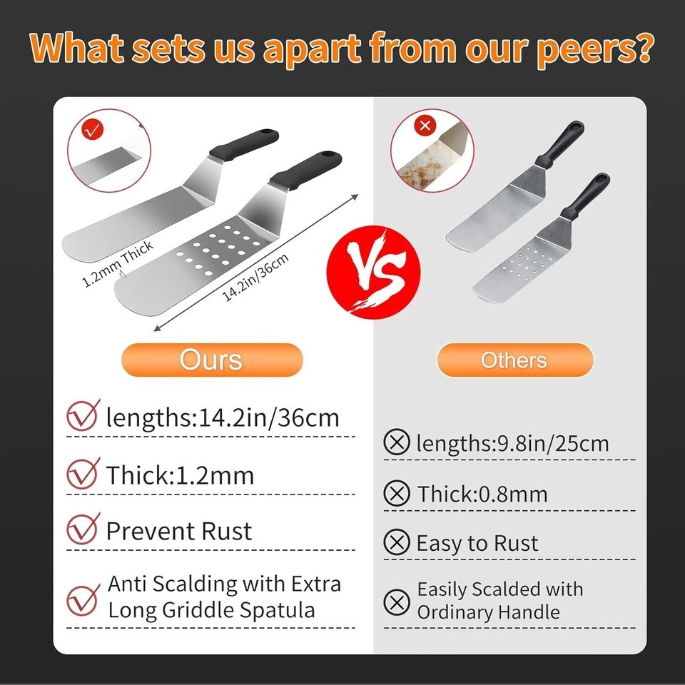 Presenting a perfectly curated flat top griddle accessories kit, beautifully packaged in an elegant gift box. It?s the perfect gift choice for any outdoor cooking enthusiast, providing them with the tools they need to grill like a professional chef. Whether it?s housewarming, birthdays, or holidays, this kit is sure to impress!