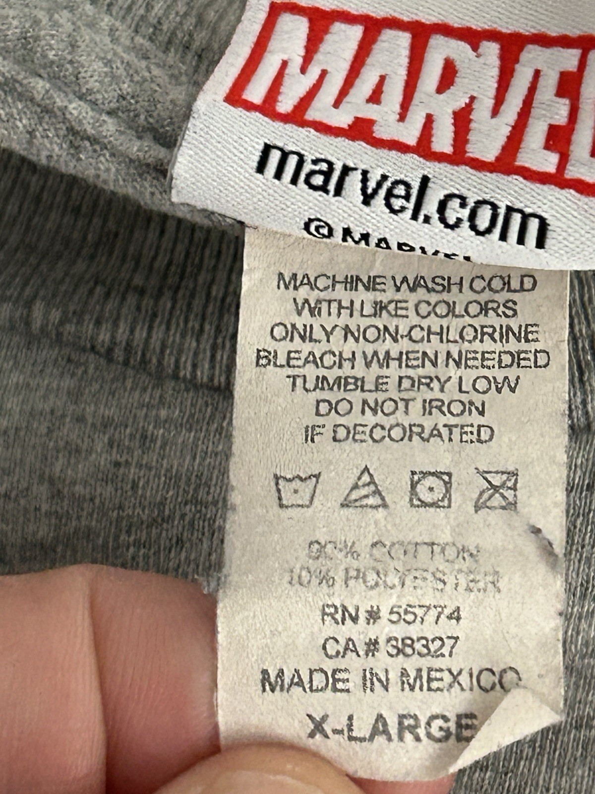 This Marvel Spider-Man T-Shirt from the 2000's features a graphic print of Spider-Man in a gray color with a crew neck and short sleeves. Made from a polyester and cotton blend, the shirt is machine washable and lightweight, perfect for wearing during the summer, fall, or spring seasons. The regular fit and XL size make it comfortable for men who are fans of Marvel Comics and the Spider-Man character. Easy to care for, this shirt is a stylish and nostalgic addition to any collection.