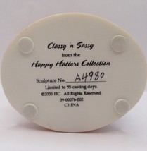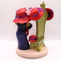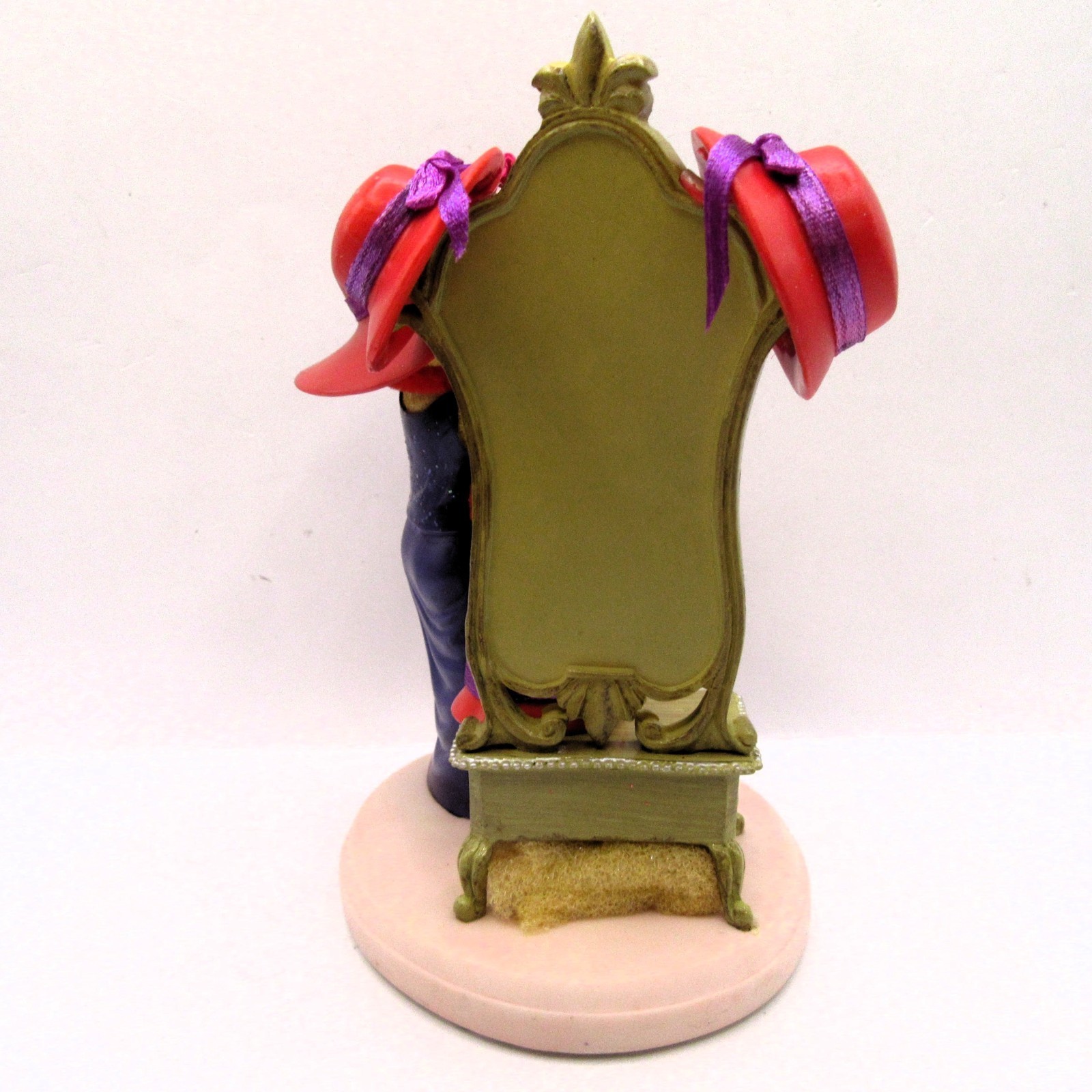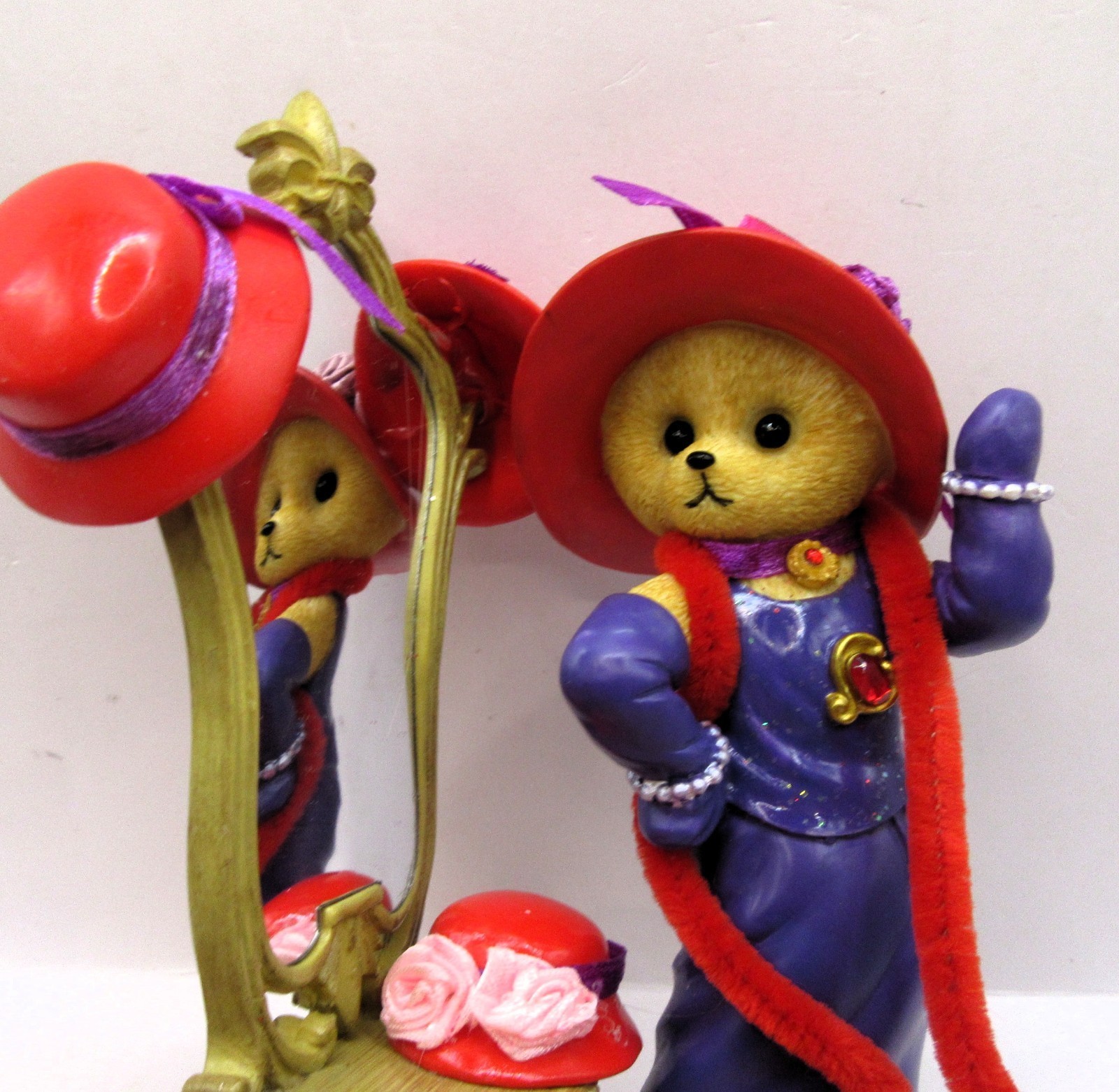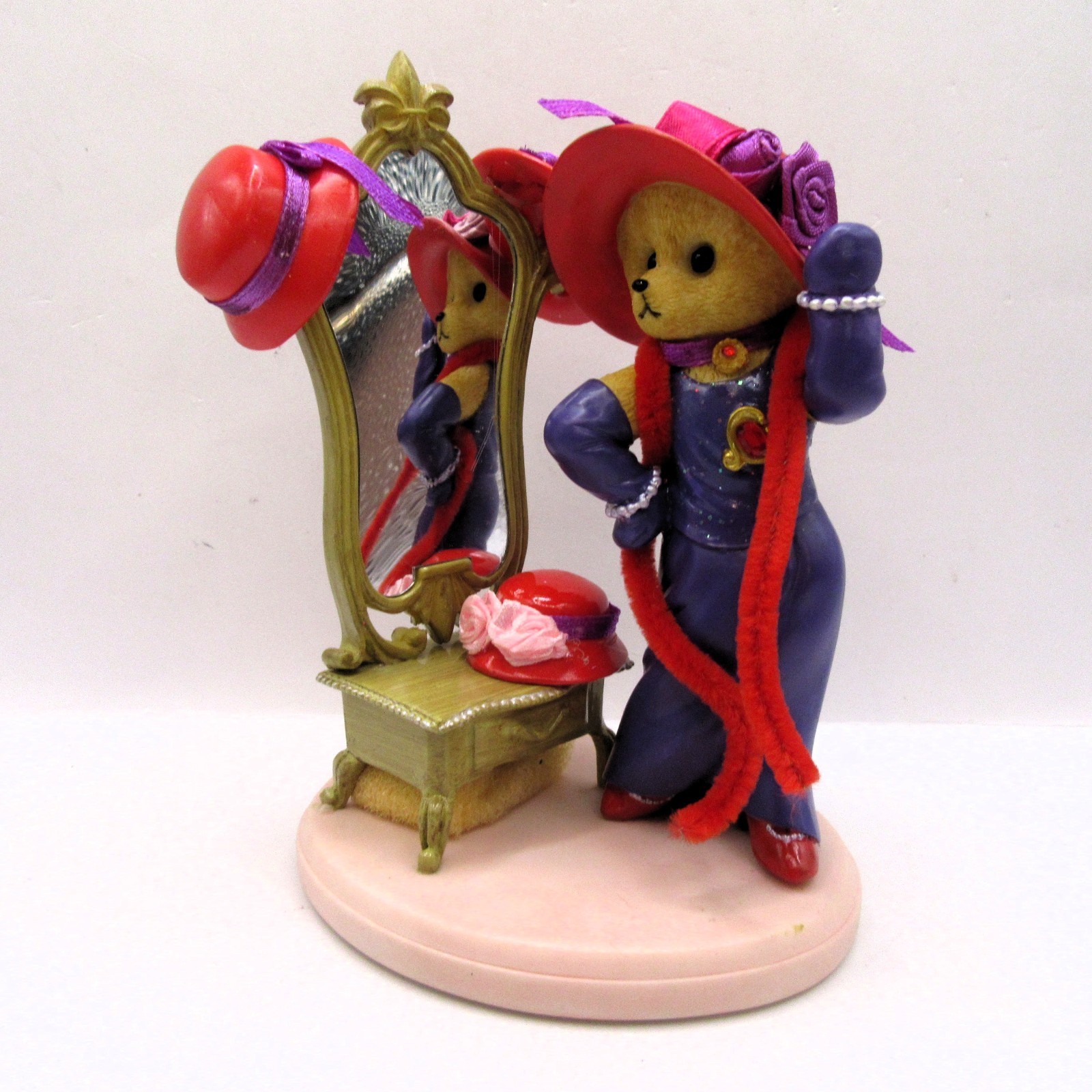 Hamilton Happy Hatters Collection Classy 'N Sassy Figurine, specifically identified by product number #A4908. A cute bear dressed in a purple outfit and a red hat, posing in front of a mirror, with another red hat on a small dresser. This item is part of the Hamilton Happy Hatters Collection. The design emphasizes details, including the bear's attire and accessories like a red scarf and pearls. The figurine is made of ceramic and porcelain.