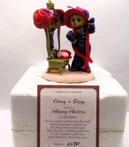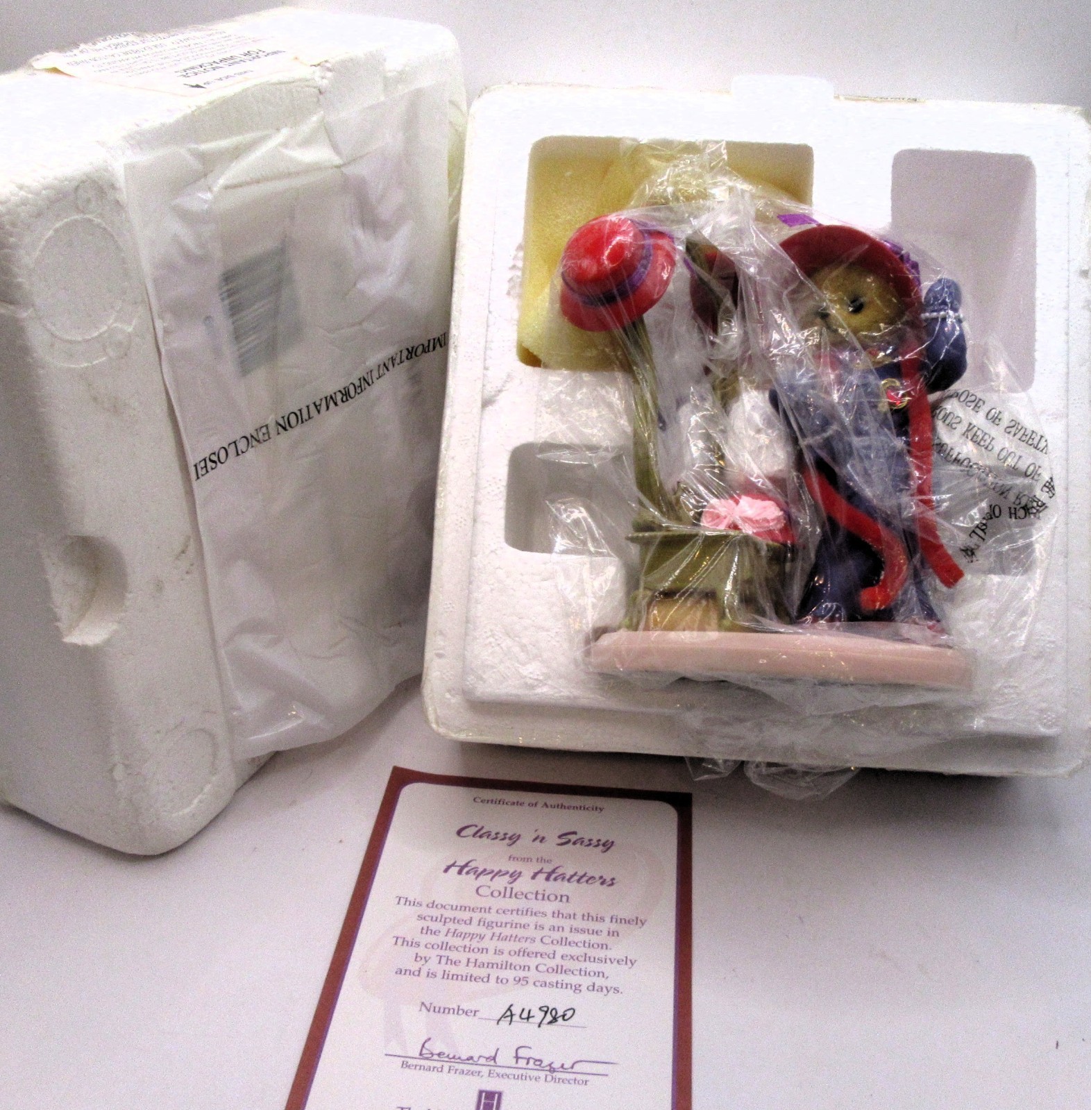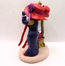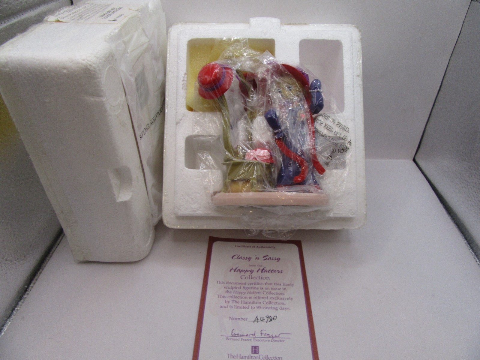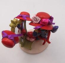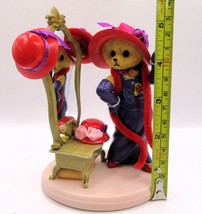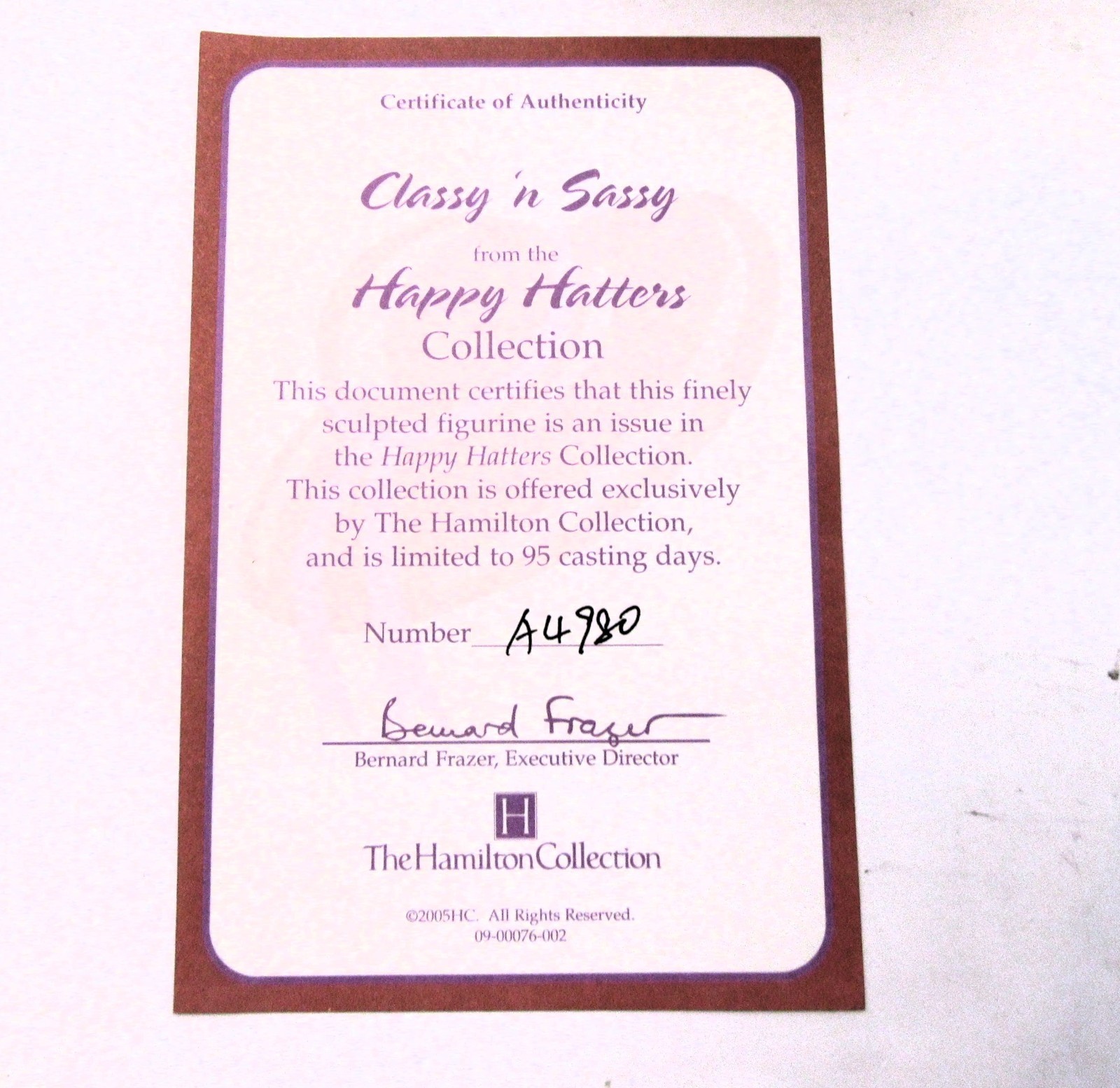 Hamilton Happy Hatters Collection Classy 'N Sassy Figurine, specifically identified by product number #A4908. A cute bear dressed in a purple outfit and a red hat, posing in front of a mirror, with another red hat on a small dresser. This item is part of the Hamilton Happy Hatters Collection. The design emphasizes details, including the bear's attire and accessories like a red scarf and pearls. The figurine is made of ceramic and porcelain.
