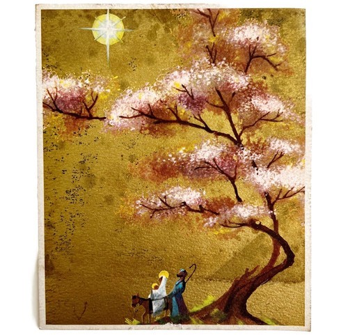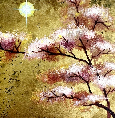 Unknown origin/brand. Gold metallic backing with hand painted adornments.