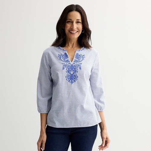 Step into a stylish look with this Women's Croft Barrow Three Quarter Sleeve Embroidered Blouse.Click on this WOMEN'S GUIDE to find the perfect fit and more!Step into a stylish look with this Women's Croft Barrow Three Quarter Sleeve Embroidered Blouse. Click on this WOMEN'S GUIDE to find the perfect fit and more!FEATURES Rounded hem Elastic closure Elastic cuffs Long sleeves Unlined V-neckFIT SIZING Regular fit 26 3/4-in. length from shoulder to hemFABRIC CARE Cotton, viscose Machine wash Imported Size: Large. Color: Blue Micro Stripe. Gender: female. Age Group: adult. Material: Cotton Blend.