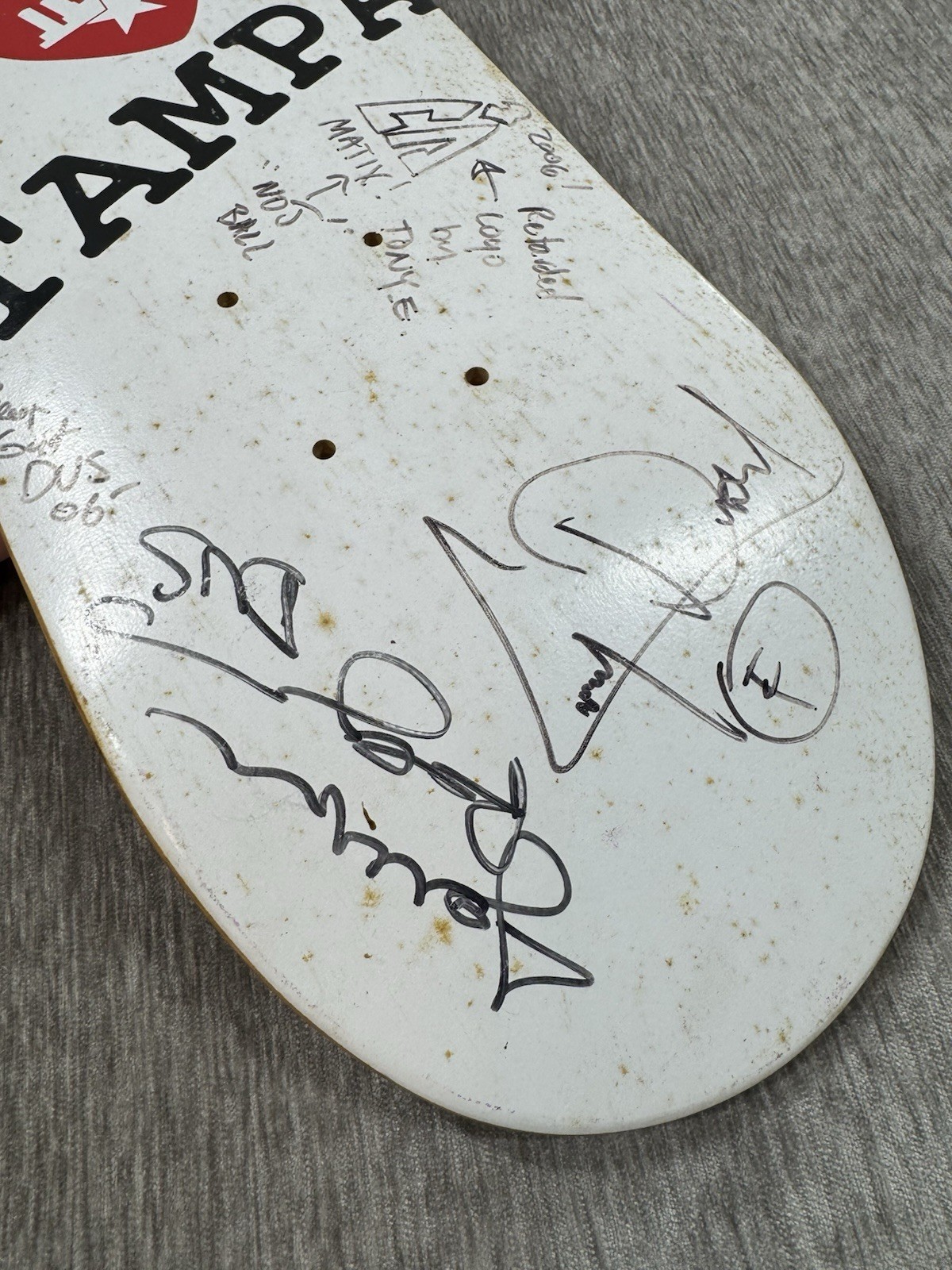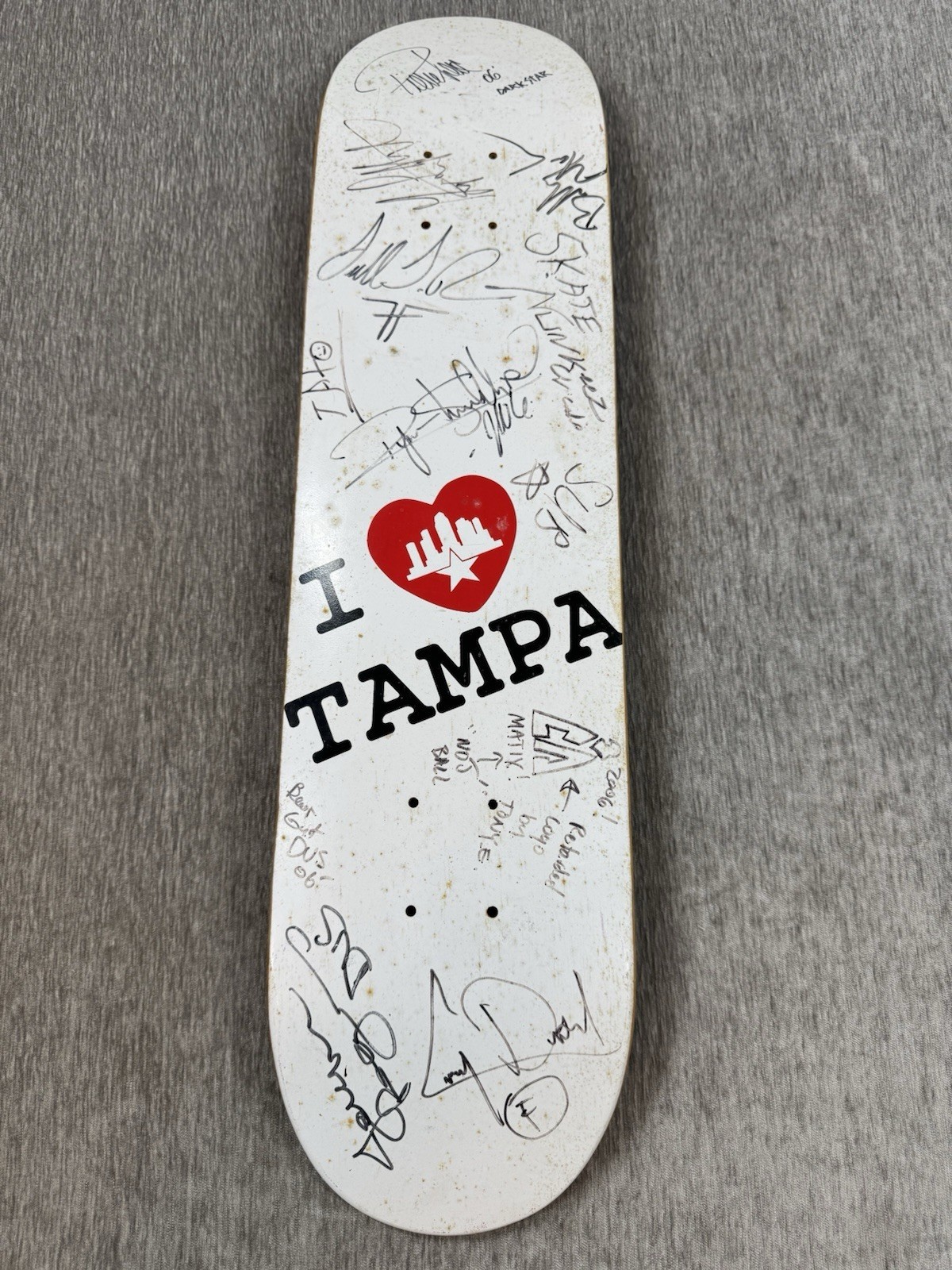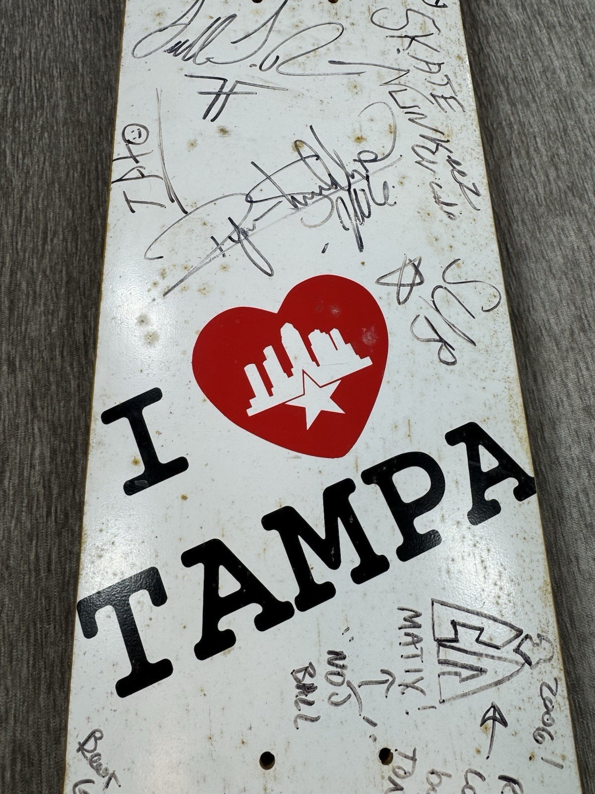 Guaranteed authentic signatures acquired at Tampa skatepark. There is spotting on the board as seen from storage. Does have some surface wear, scratches, some scuffs on signatures as seen. Some of the signatures have faded over time. Please see all photos.