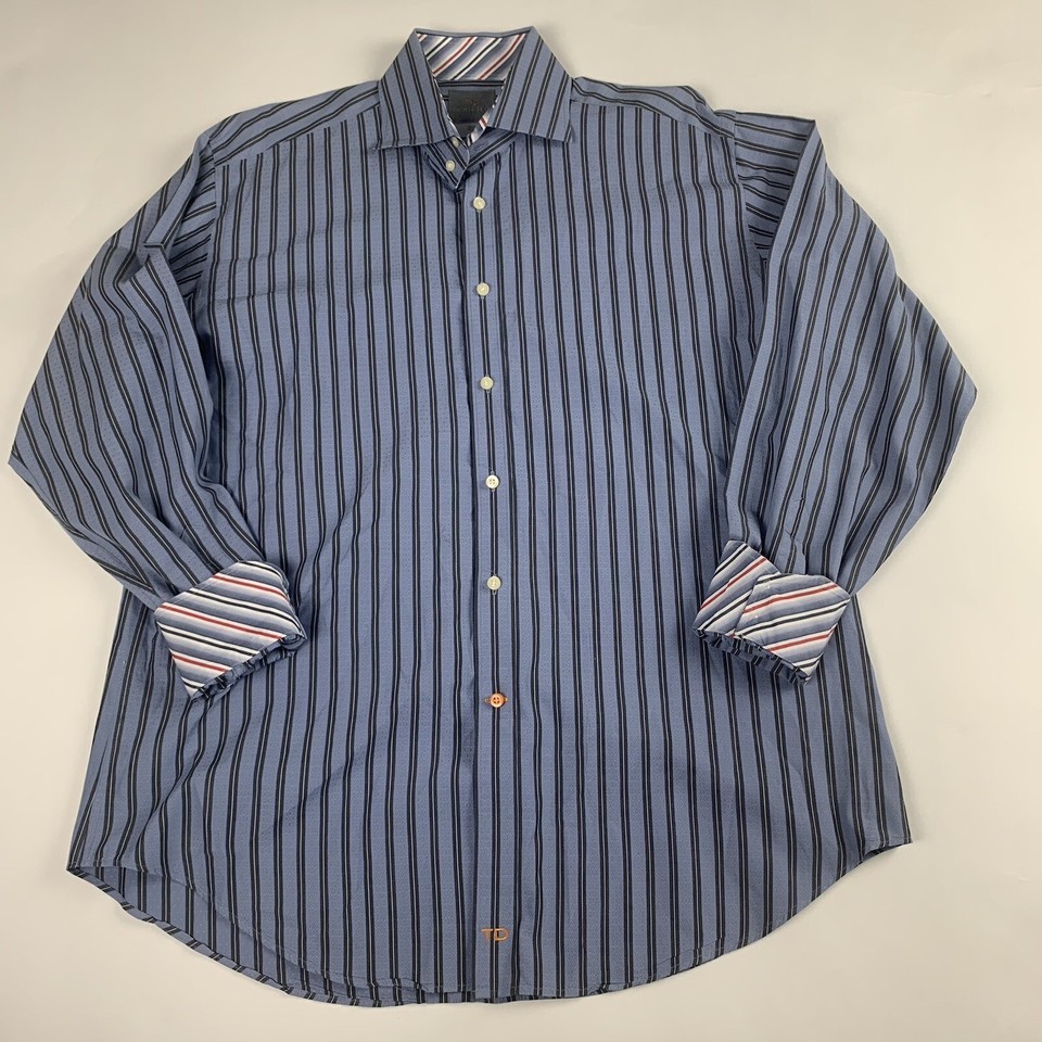 Thomas Dean Mens Shirt Large Blue Striped Long Sleeve Button Flip Cuff Dress