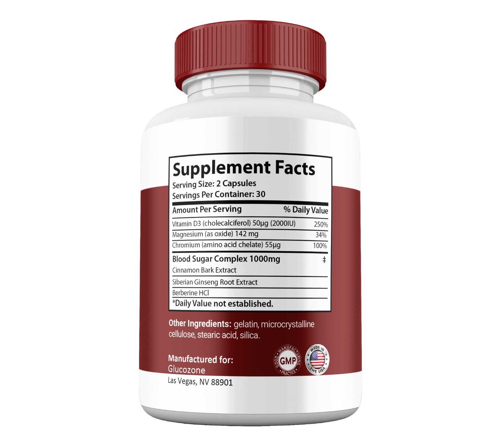 Gluco Zone supplement, each bottle contains 30 servings of a maximum strength blend made with Vitamin D3, Cinnamon Bark Extract, Siberian Ginseng Root Extract, and Berberine. Made in a certified facility, this formula is simple to take, just two capsules with a glass of water, and even easier to make part of your day.