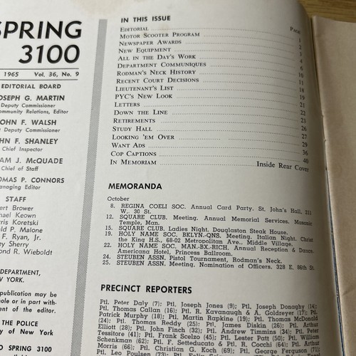Spring 3100 NYPD Magazine October 1965, 50 pages in good condition showing small signs of wear. Please see image of Table of Content for complete issue contents.