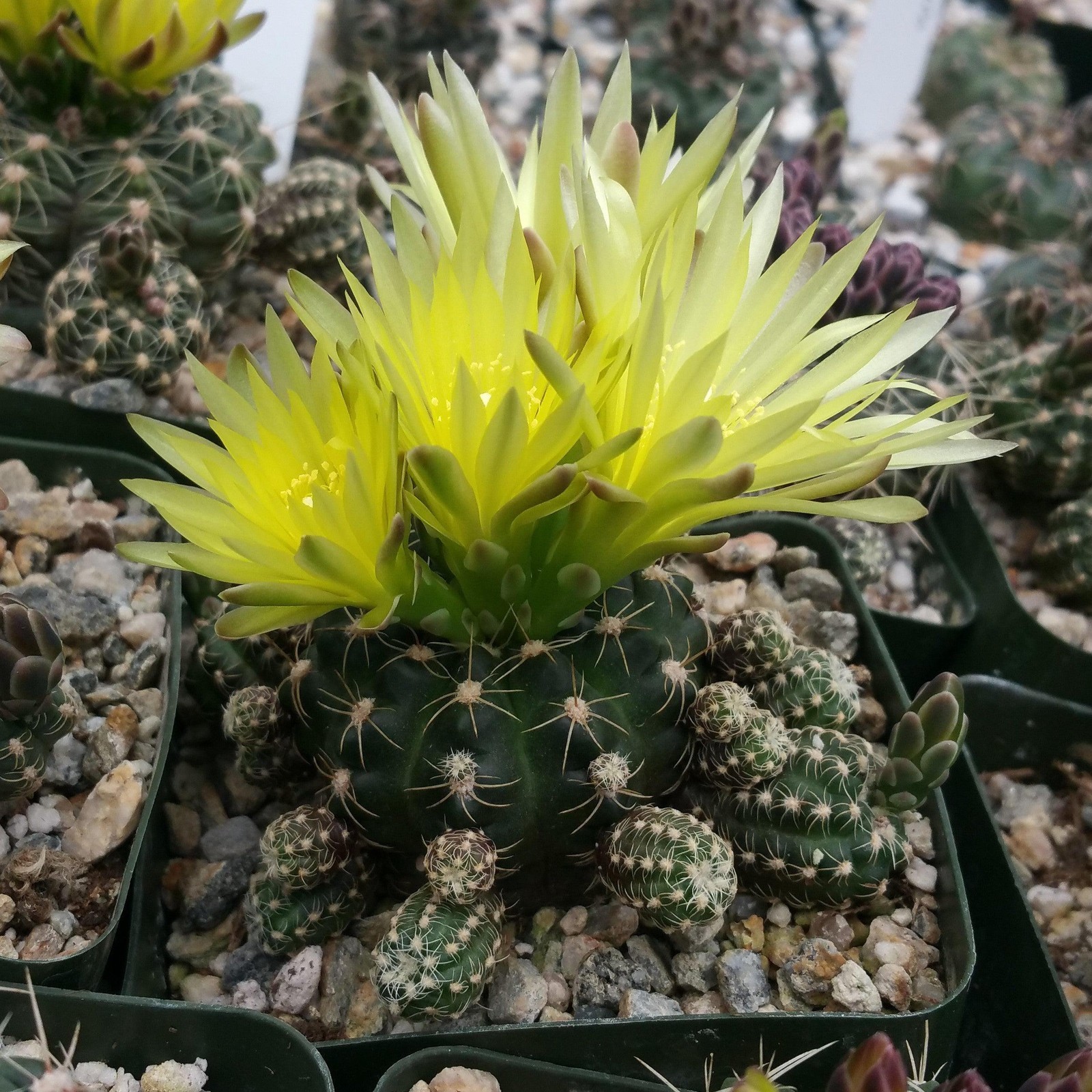 Gymnocalycium dopianum is a variation of G. Andreae. It is a low growing prickly cactus, often branching basally in cultivation to form clusters to 15 cm or more wide. This species is different from the general run of gymnocalyciums in the color of its flowers, in this case a brilliant sulfur-yellow.