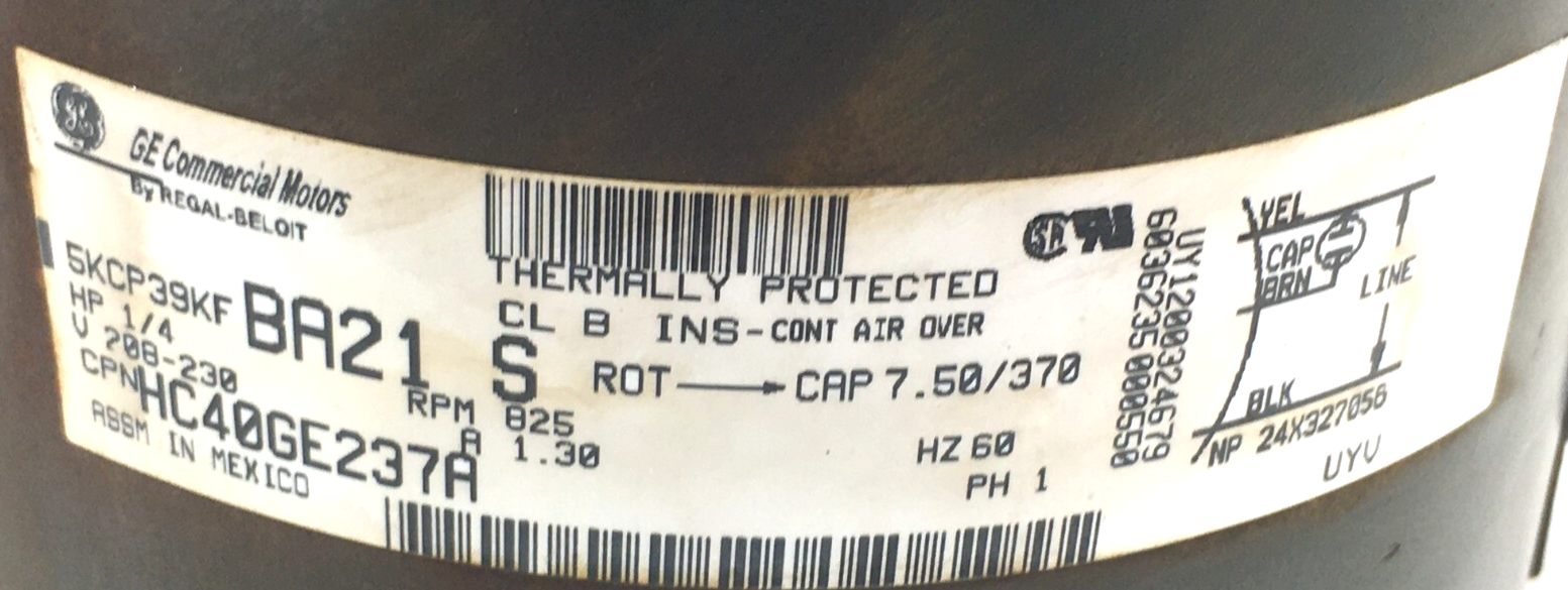 This is GE 5KCP39KFBA21S Carrier HC40GE237A FAN MOTOR 1/4 HP 208-230 VAC 825 RPM 1 PH used part.