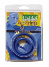 Nitrile Cock Ring Set is available in five colors: Black, Blue, Purple, Red and White Each sold separately. 3-pack of different sized rings. These amazingly durable cock rings are made of 100% skin-safe nitrile, the same material used in hospital gloves. Nitrile cock-rings are strong yet flexible, snapping back to shape after each use. Nitrile is a latex-free, strong and flexible material. Because it is latex-free, nitrile is a preferred cock ring material for men with rubber allergies. And not to worry, they are compatible with silicone water-based lubes! Set includes 1.25 inches, 1.5 inches and 2 inches. Nitrile Cock Ring Blue Set from Spartacus A Passion For Quality Catalog page 21. Made in the USA.
