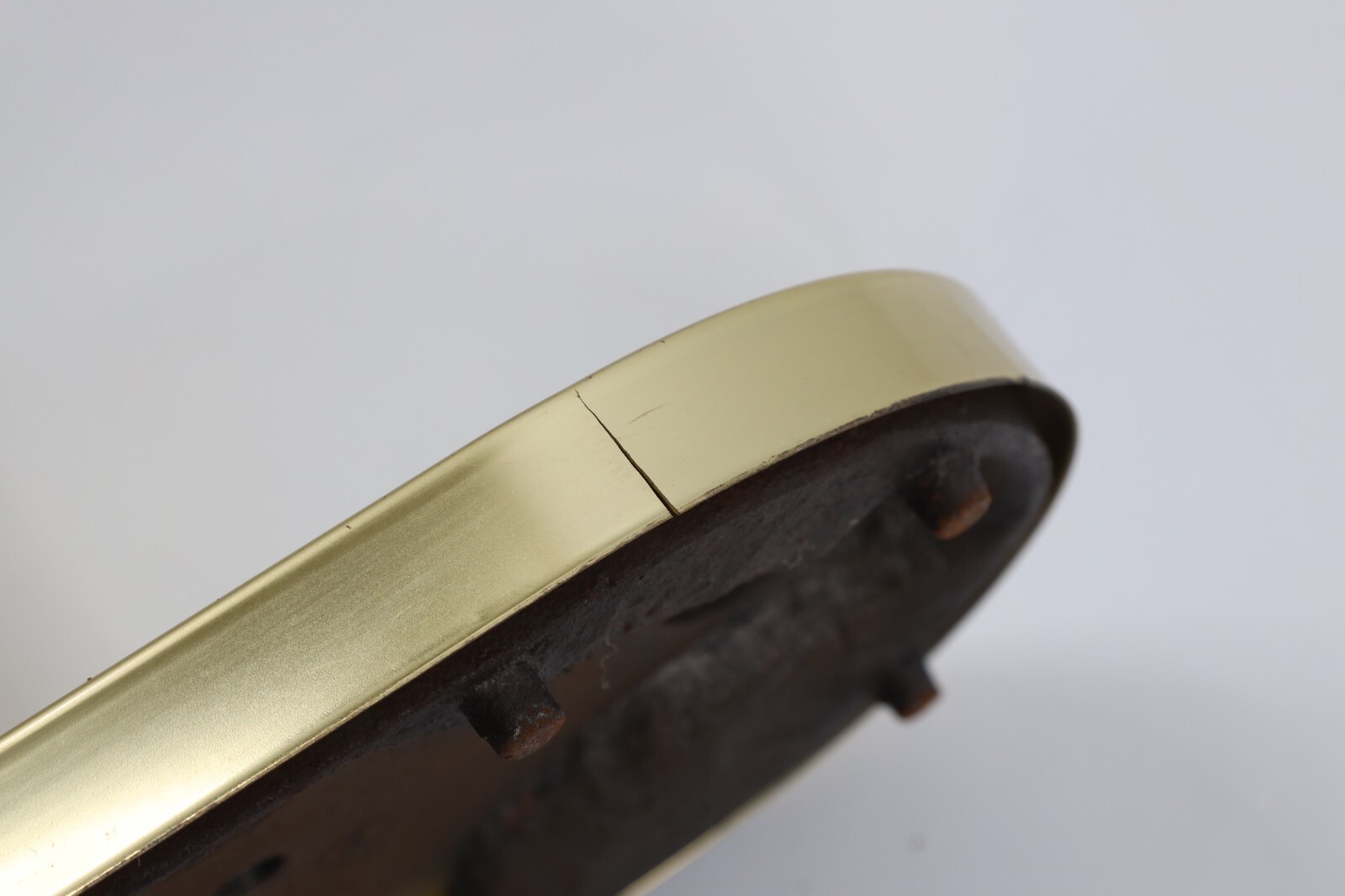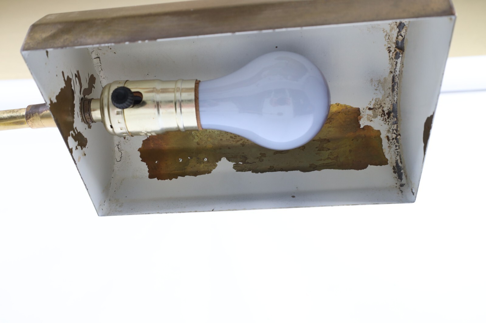 Patina on the metal. Inside white paint is chipping off. Has blemishes, scratches, and stains on head, neck, and base. Small crack on the base. Tested and working. Will not ship with a light bulb