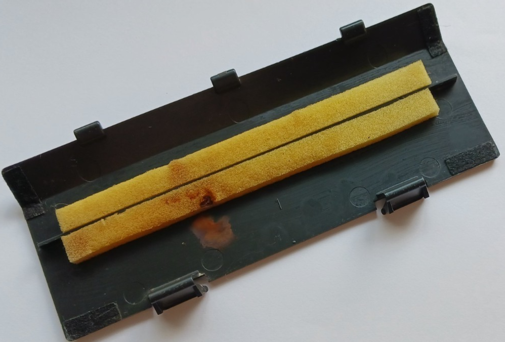 This part is in overall very good condition, not warped or cracked, and it has it's latches intact. Even the "sponge" type pad inside is intact and not broken or darkened with age as often happens with these. There is a big of staining on the inside of the part from prior battery leakage.