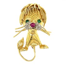 18k Yellow Gold Vintage Lion Brooch with Emerald, Ruby, and Diamond