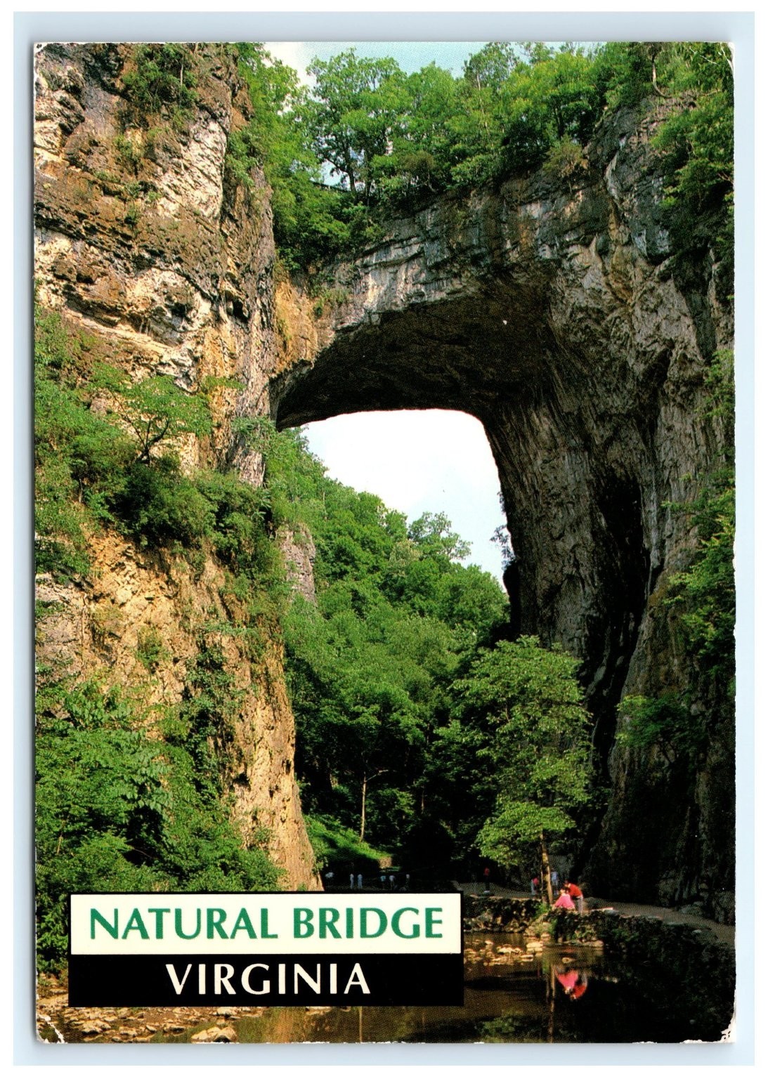This vintage postcard showcases the iconic Natural Bridge in Virginia, renowned as one of the Seven Natural Wonders of the World. The image highlights the impressive natural limestone arch surrounded by lush green foliage and a serene water reflection, capturing the breathtaking beauty of this geological landmark. The postcard features vibrant colors and a detailed lithograph print style typical of mid-20th century postcards.