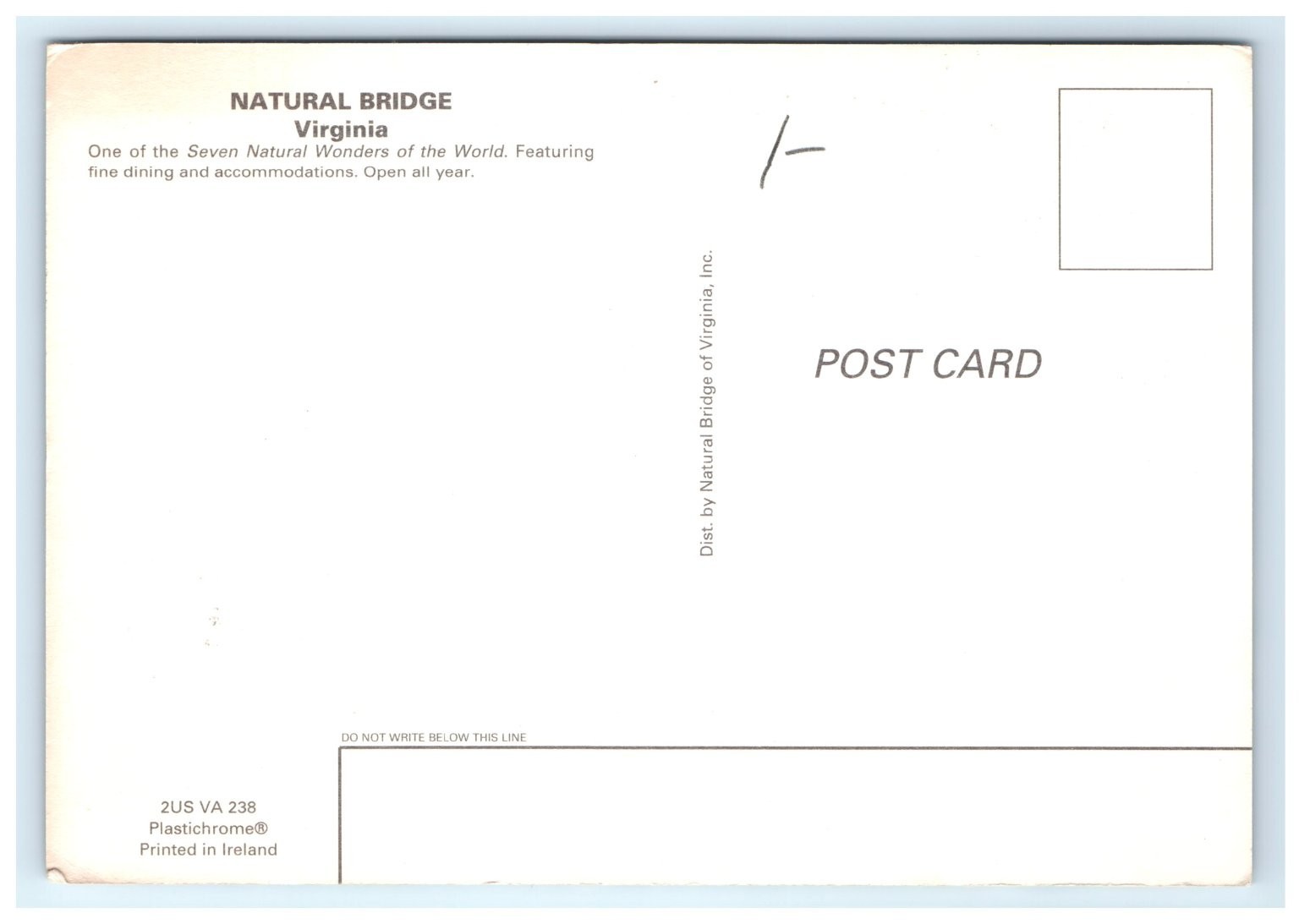 Printed using the Plastichrome process in Ireland, this 6x4 inch continental size postcard offers a glossy, high-quality finish known for its rich color saturation and durability. Distributed by Natural Bridge of Virginia, Inc., it also promotes the site?s fine dining and accommodations, making it a collectible piece for enthusiasts of natural landmarks and vintage travel ephemera. A perfect addition for collectors or those with an interest in American natural wonders and scenic postcards.
