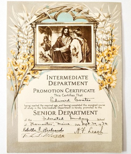 1924 Intermediate Department Promotion Certificate Signed Religious Maine E85G