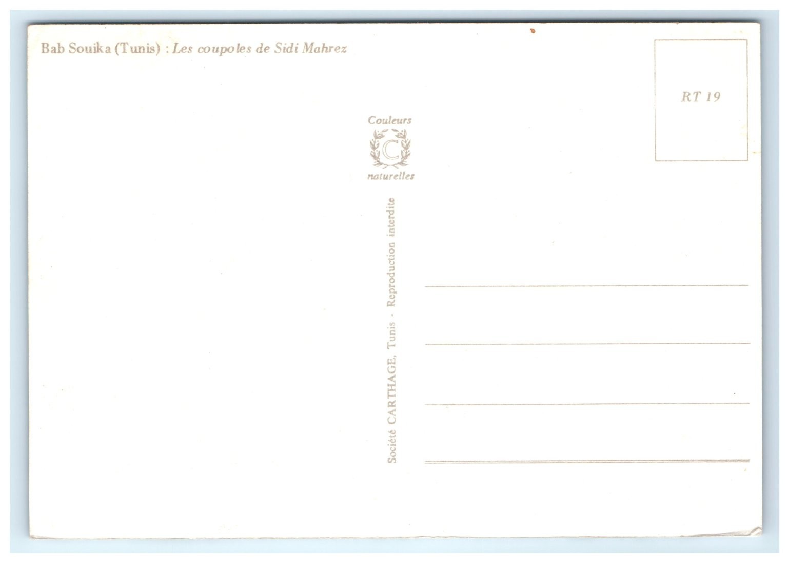 This vintage postcard features a vibrant day scene of Bab Souika in Tunis, highlighting the iconic white domes of the Sidi Mahrez mosque. The image captures a bustling street filled with classic cars and pedestrians under strings of festive lights. The postcard showcases Mediterranean architectural charm with its distinctive domed roof and colorful market fronts, offering a glimpse into Tunisian life during the mid-20th century.