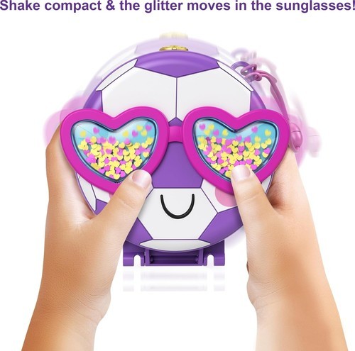 The Polly Pocket Soccer Squad compact has a soccer ball design featuring cute sunglasses on the exterior filled with shakable glitter and comes with micro Bella and friend dolls.