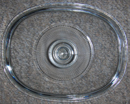On sale today is one (1) Pyrex Corning Ware F-12-C French White 1.5 Oval Glass Lid Scalloped Cover used Genuine clear glass replacement lid for your CorningWare French White series oval ovenware casseroles. This cover fits the F-12-B (F12) 1.5 quart (and liter) bakeware dishes, and others of the same dimensions. This domed glass lid is marked Pyrex F12C, and measures 7 1/2"x9 5/8" overall. Very good condition, no chips cracks, or deep scratches.