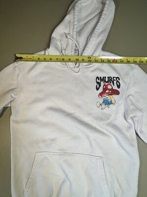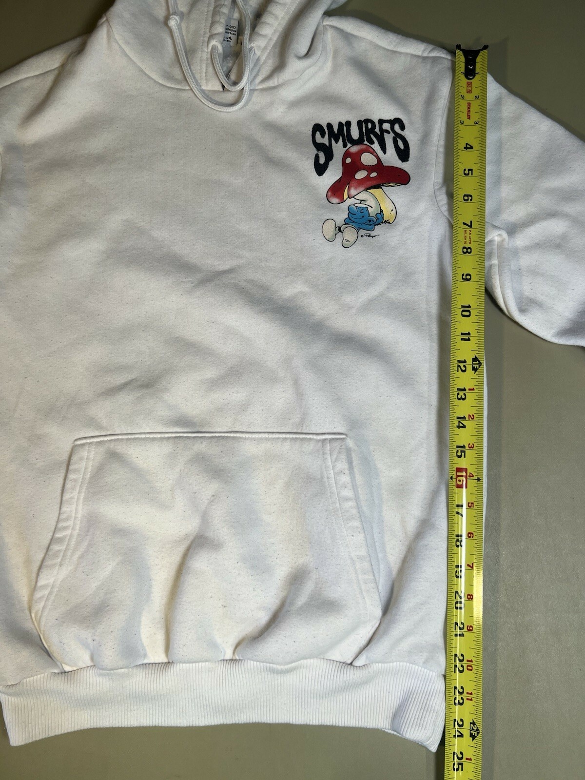 The product is a men's Smurfs hoodie in size small, featuring a white color and a pullover style. This hoodie is perfect for fans of the Smurfs franchise, offering a comfortable and casual activewear option. Made from high-quality materials, this hoodie is ideal for men looking for a fun and stylish addition to their wardrobe.