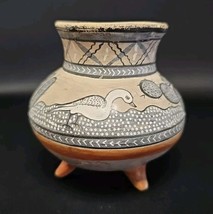 Vintage Mexican Pottery Vase 3 footed WHITE CRANE Bird Botanical MEXICO Signed