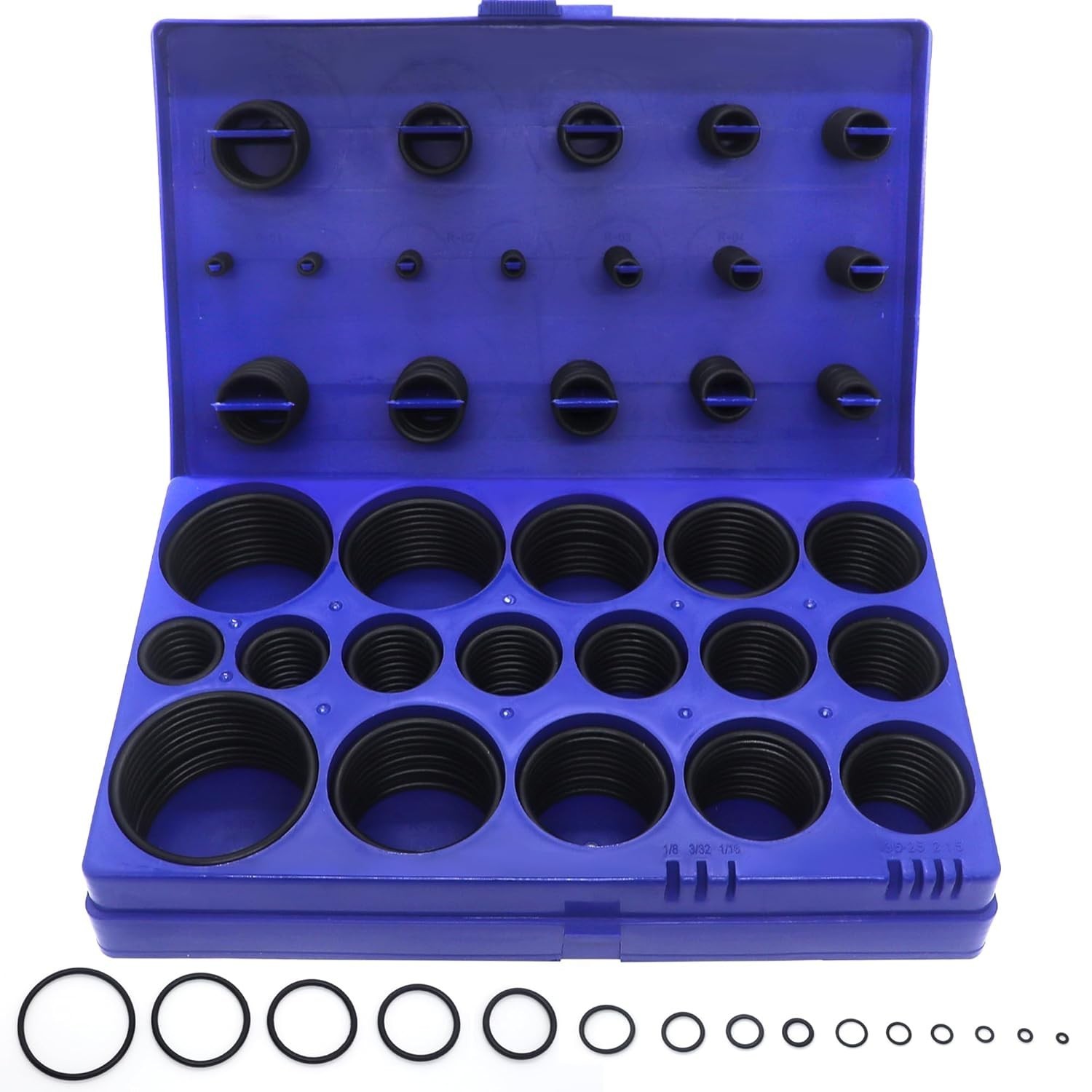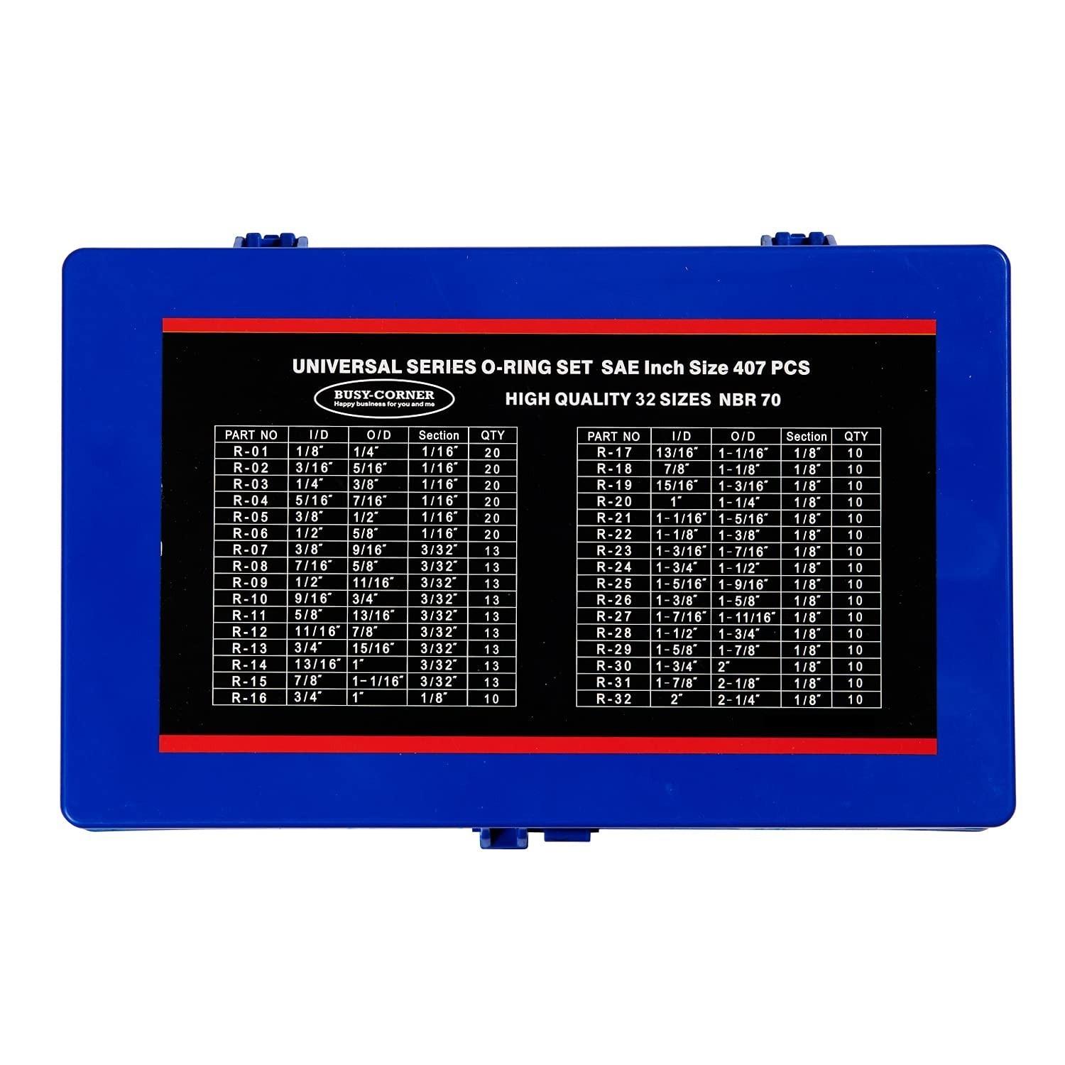 Discover the versatility and durability of our high-quality Nitrile (NBR) O-Rings, crafted from 70 shore material. Resistant to heat, extreme temperatures, water, air, and a broad range of chemicals including petroleum products, mineral oil, and fuels, these O-Rings ensure reliable performance across various applications. The set includes 32 sizes, from 1/8?? I.D. x 1/4?? O.D. to 2?? I.D. x 2-1/4?? O.D., making it easy to find the perfect fit for plumbing, machinery, hydraulic and pneumatic repairs, automotive work, and more. Packaged in a sturdy storage case, each size stays organized and protected, facilitating quick selection and transport. At BUSY-CORNER, we prioritize product quality and customer satisfaction. For any questions or assistance, our dedicated support team is ready to help.