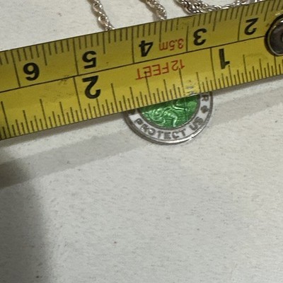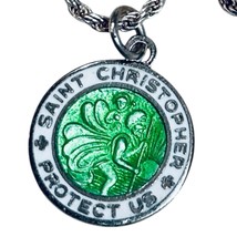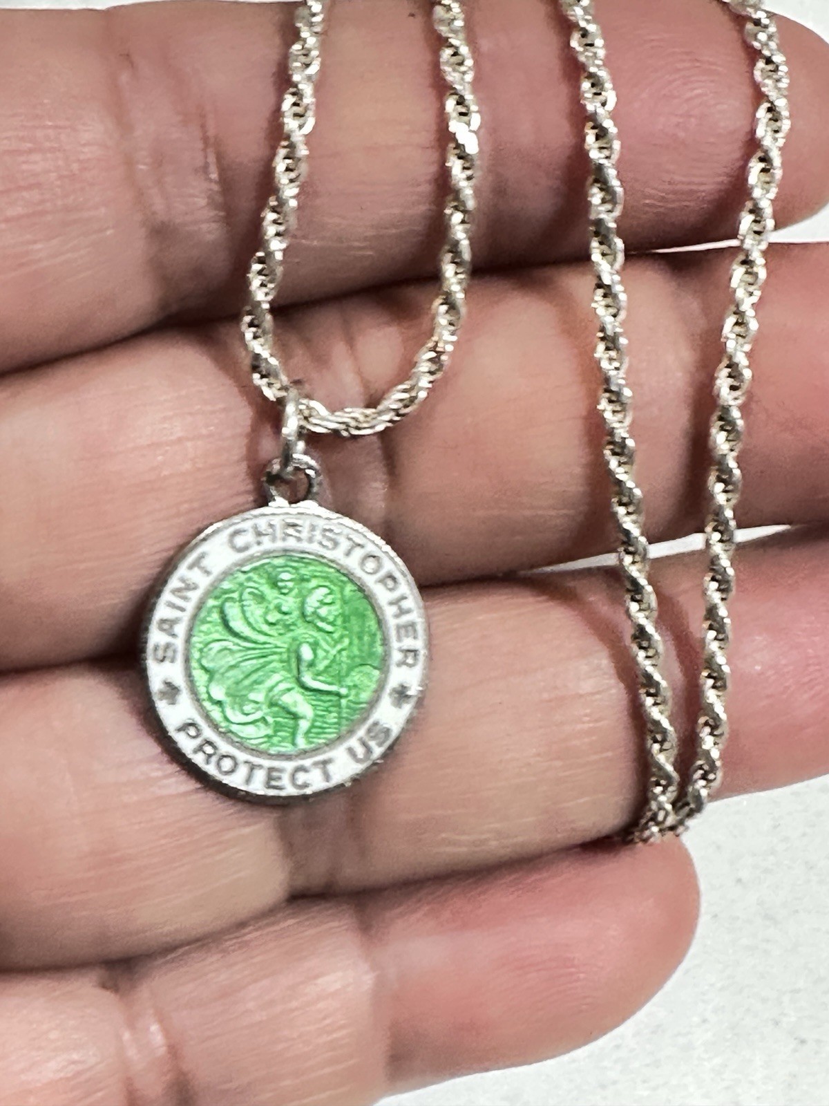vintage sterling silver saint christopher Green Enamel Medal Charm 19.5”chain