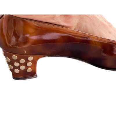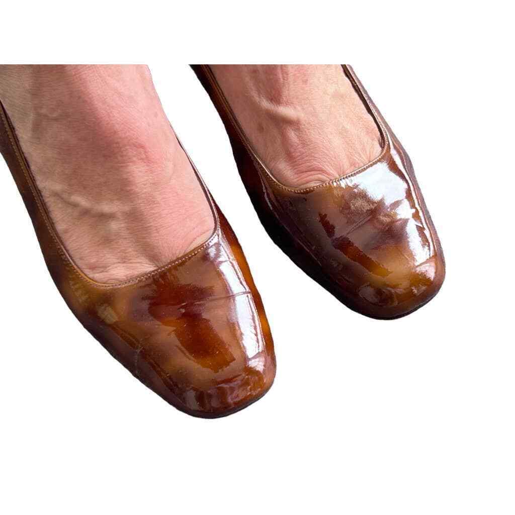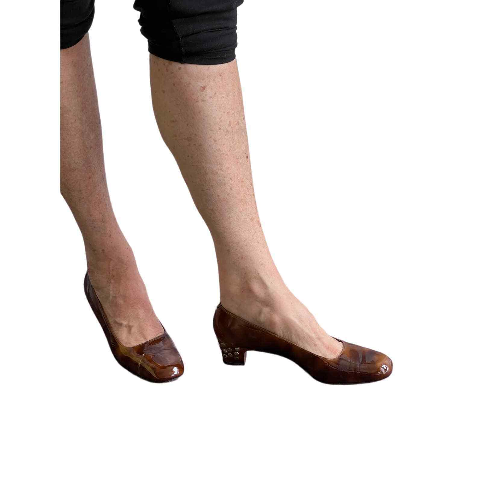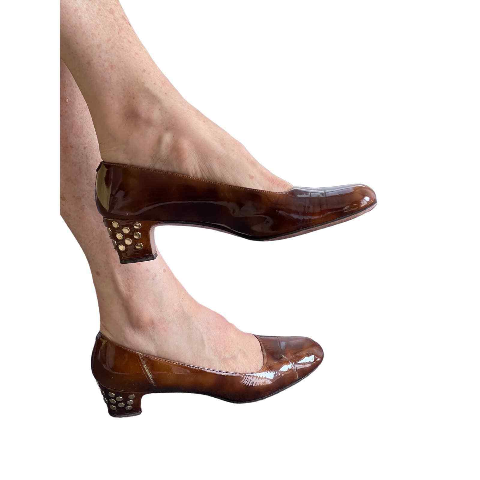VTG 70s SAKS FIFTH AVENUE Square Toe Brown Patent Leather Pumps Studded 7.5B