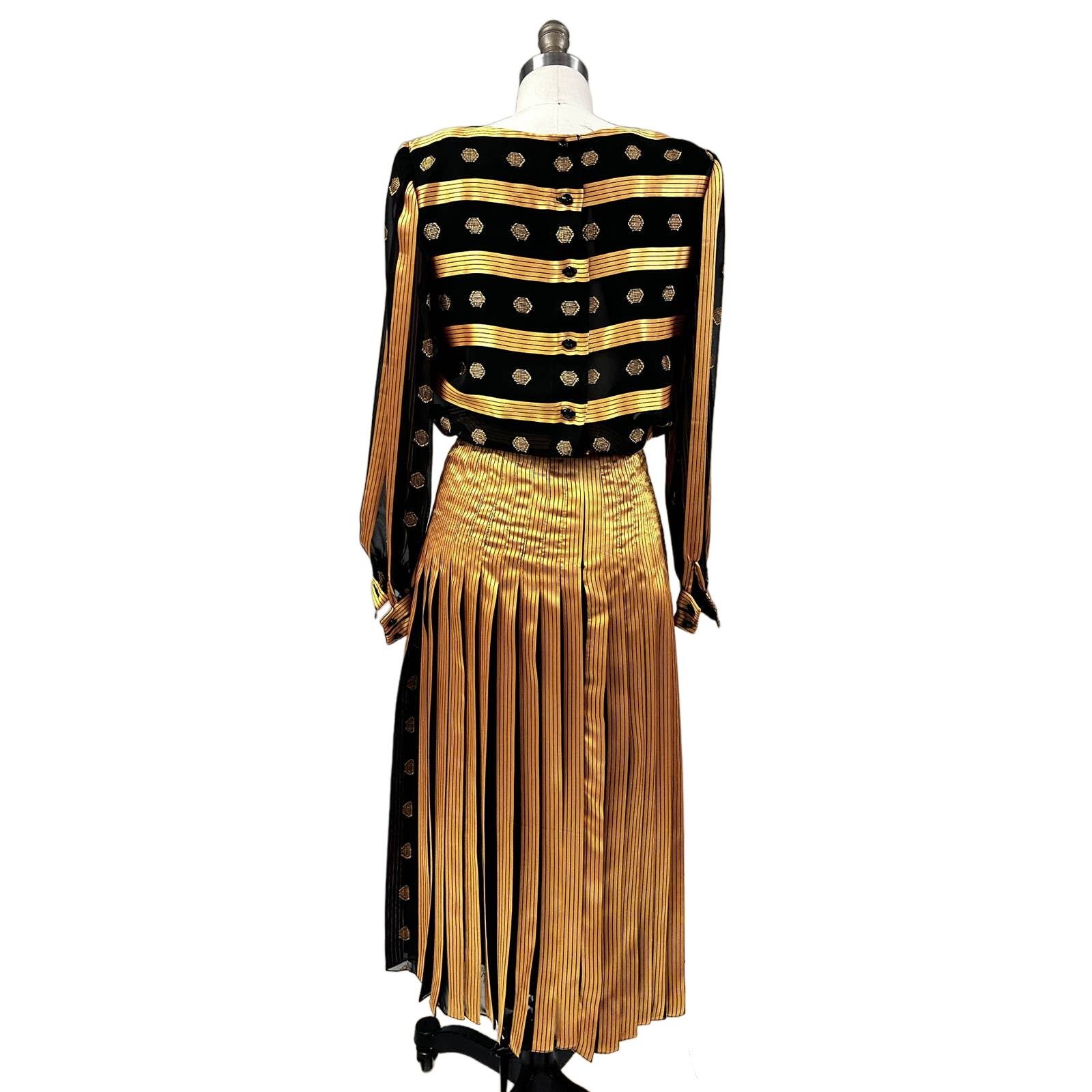 Vintage 1980s Raul Blanco cocktail dress in shimmering gold and black polyester with a silk-like hand. Designed with horizontal pleats across the bodice and vertical pleats in the skirt, showcasing a masterful play of texture and movement. Features shoulder pads, six-button back closure, long sleeves, and elegant midi length.