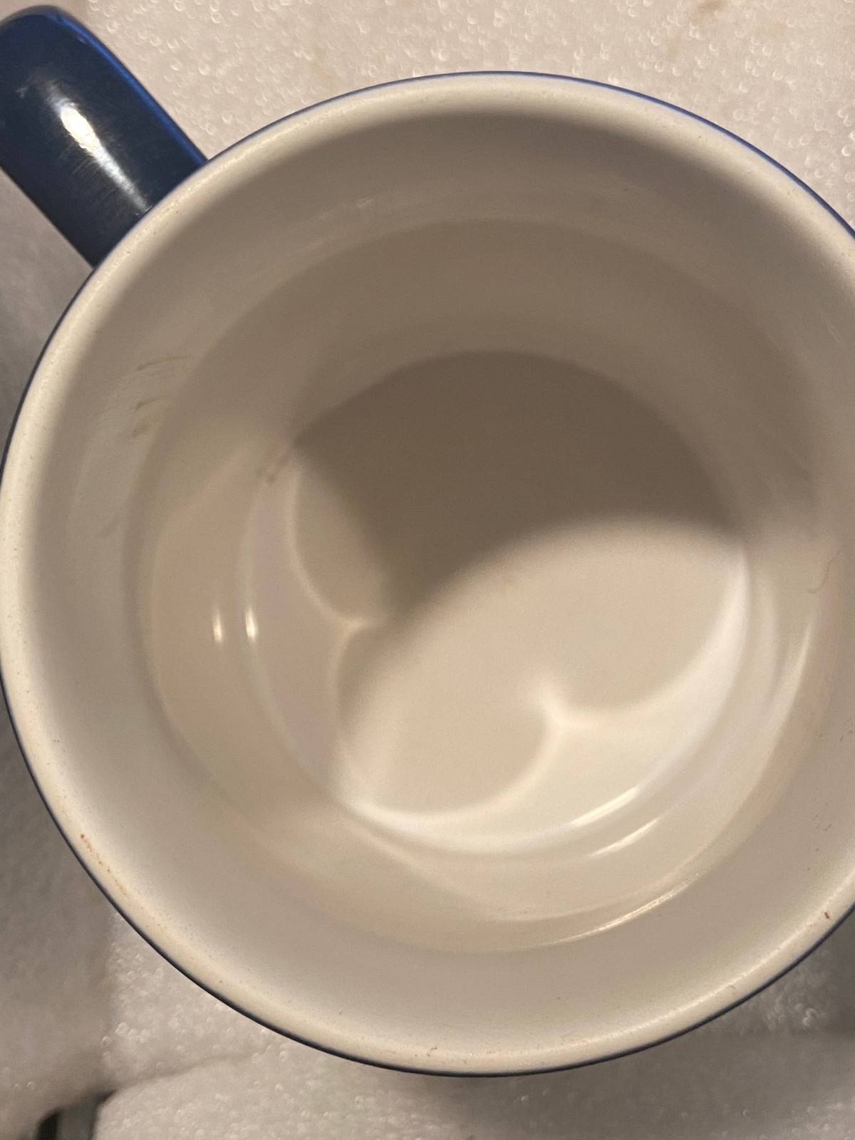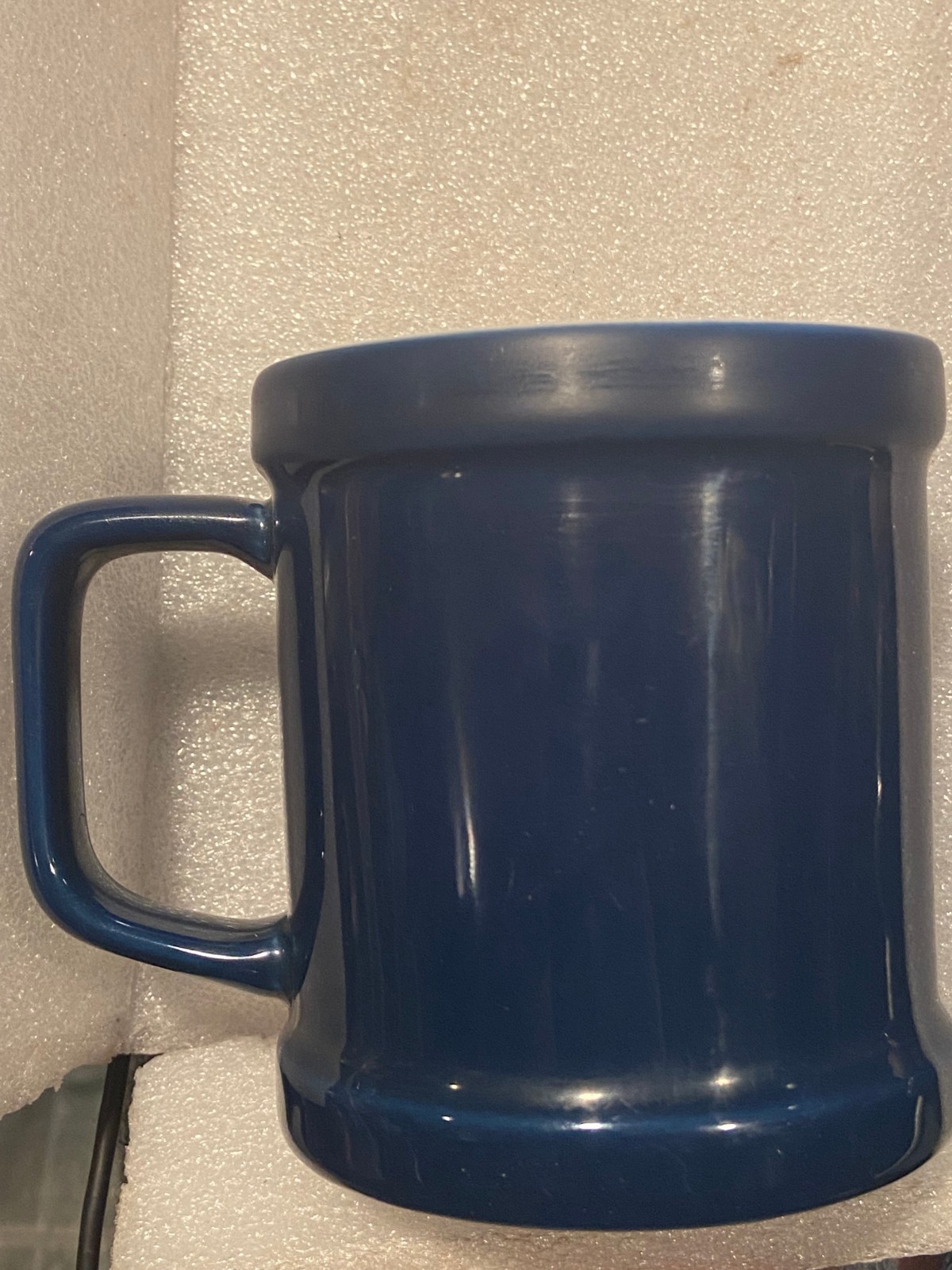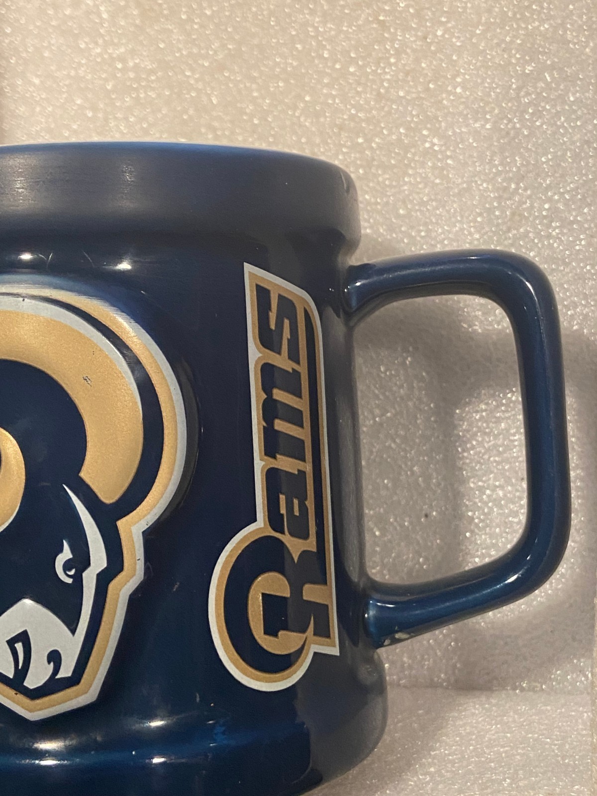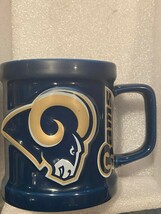 The Rams mug is pre-owned and in nice condition. The inside looks nice and the outside is Rams colors and says: RAMS with the Rams logo 3d on one side. The other side is blank.