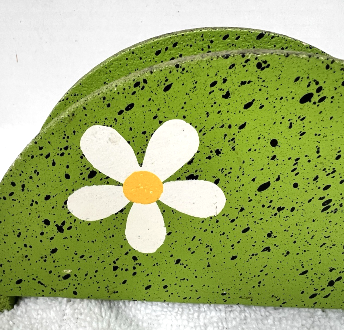 Vintage Daisy Napkin Letter Holder Green Speckled Wood Painted 7 x 3 7/8 x 2 1/4